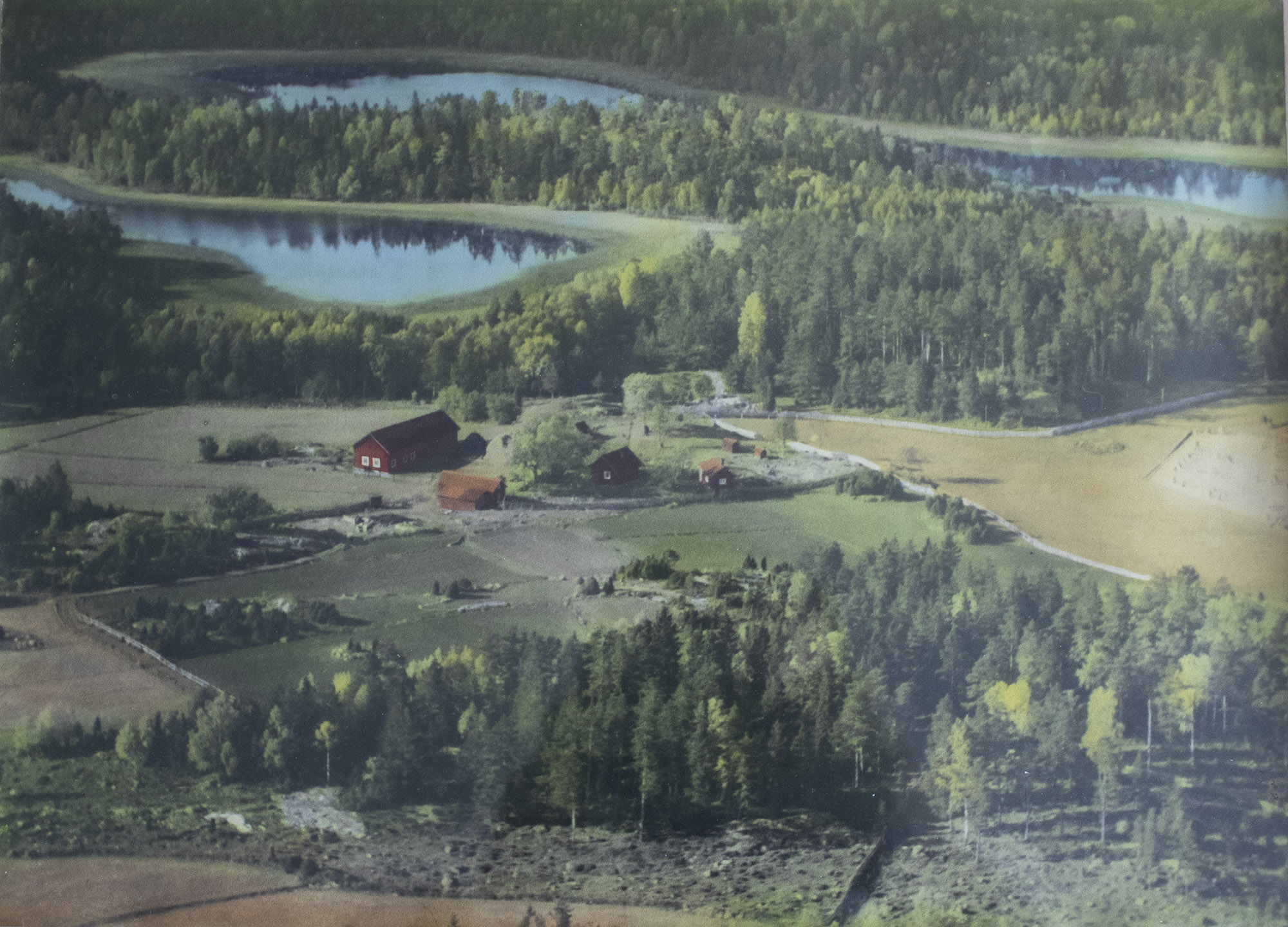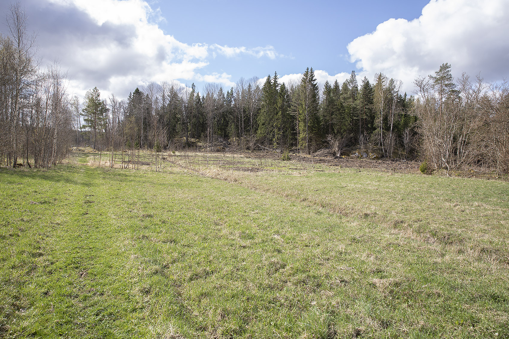 Den oplanterade delen av åkern på östra sidan av ladan vid Hersbyön. I bortkanten den nyligen avverkade granplanteringen bakom lagården.
