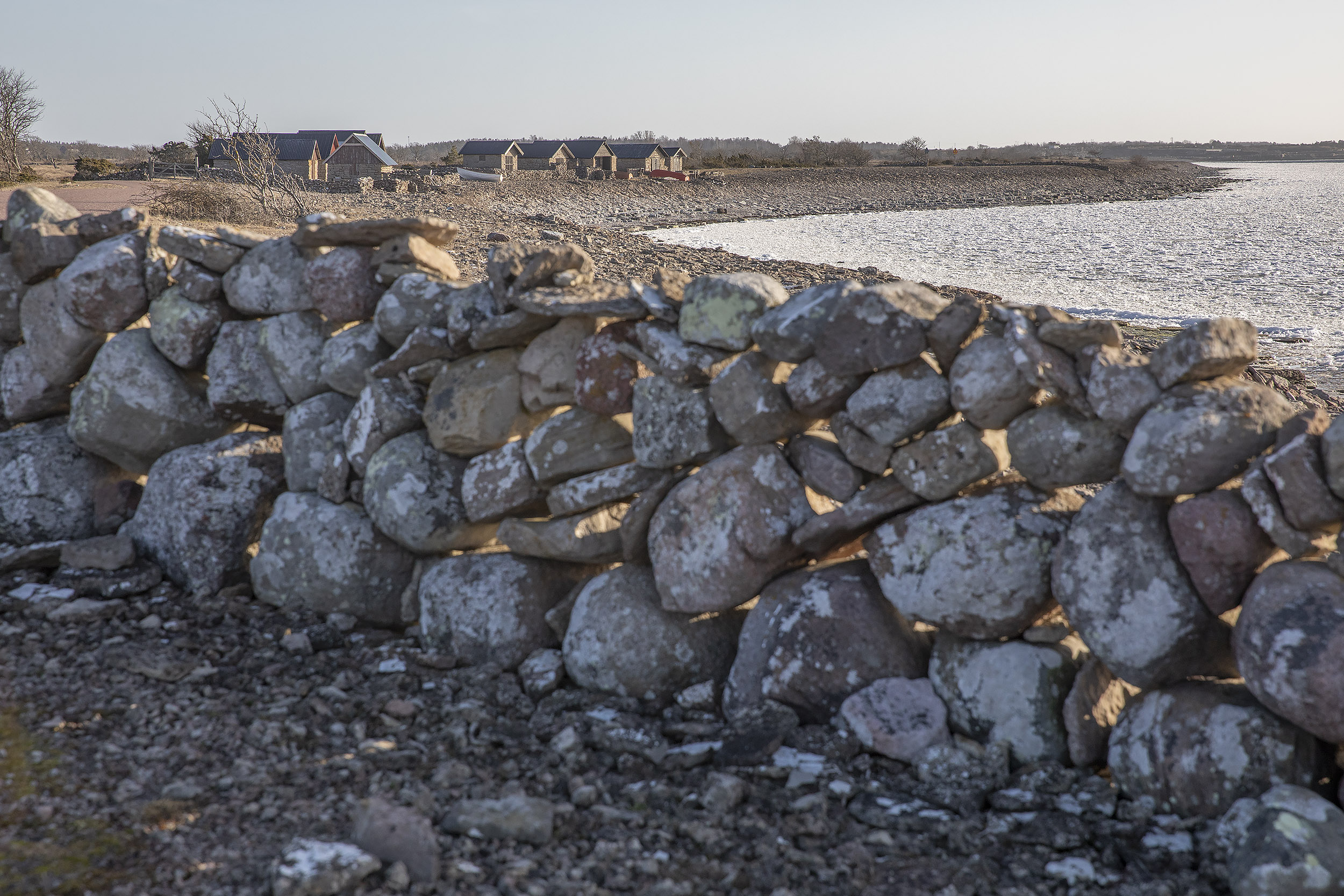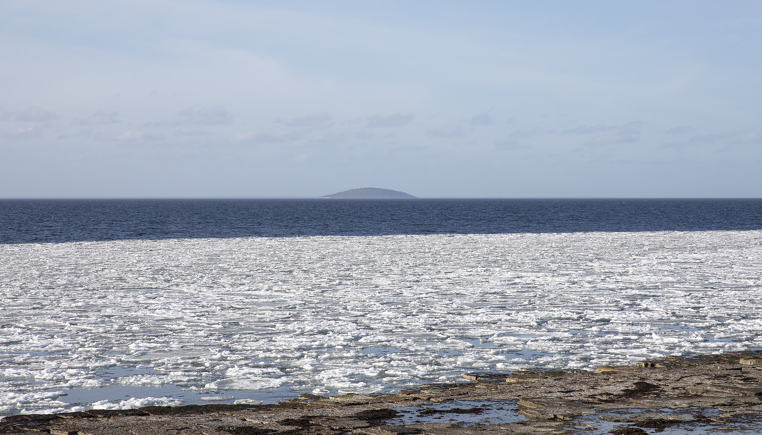 Isen i Kalmarsund hade blåst in mot land på nordvästra Öland. Blå Jungfrun i fonden.