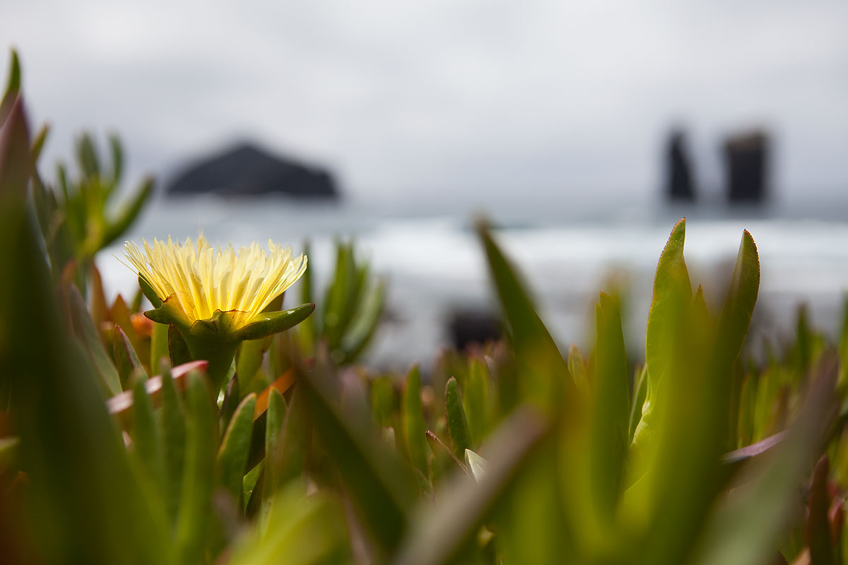 Den gula middagsblomman, införd från Sydafrika, blommar på stranden innaför raukarna vid Mosteiros längst i väser på San Miguel.