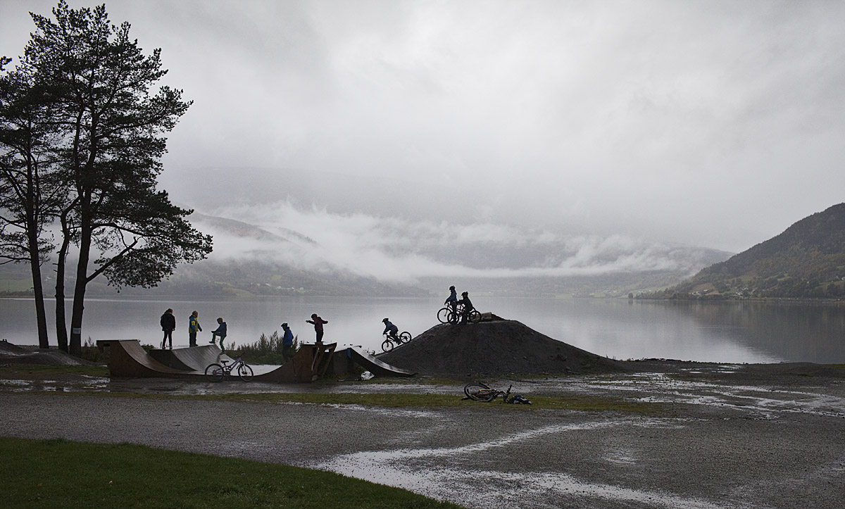 Bilder från Voss, första dagen: En dimmig morgon, men solen är på väg att bryta igenom på Prestegardsmoen. Som om de visste att jag behövde något att hänga upp dimman på, kom ett gäng skolungar löpande. Glada var de, och jag också. En fin morgon!