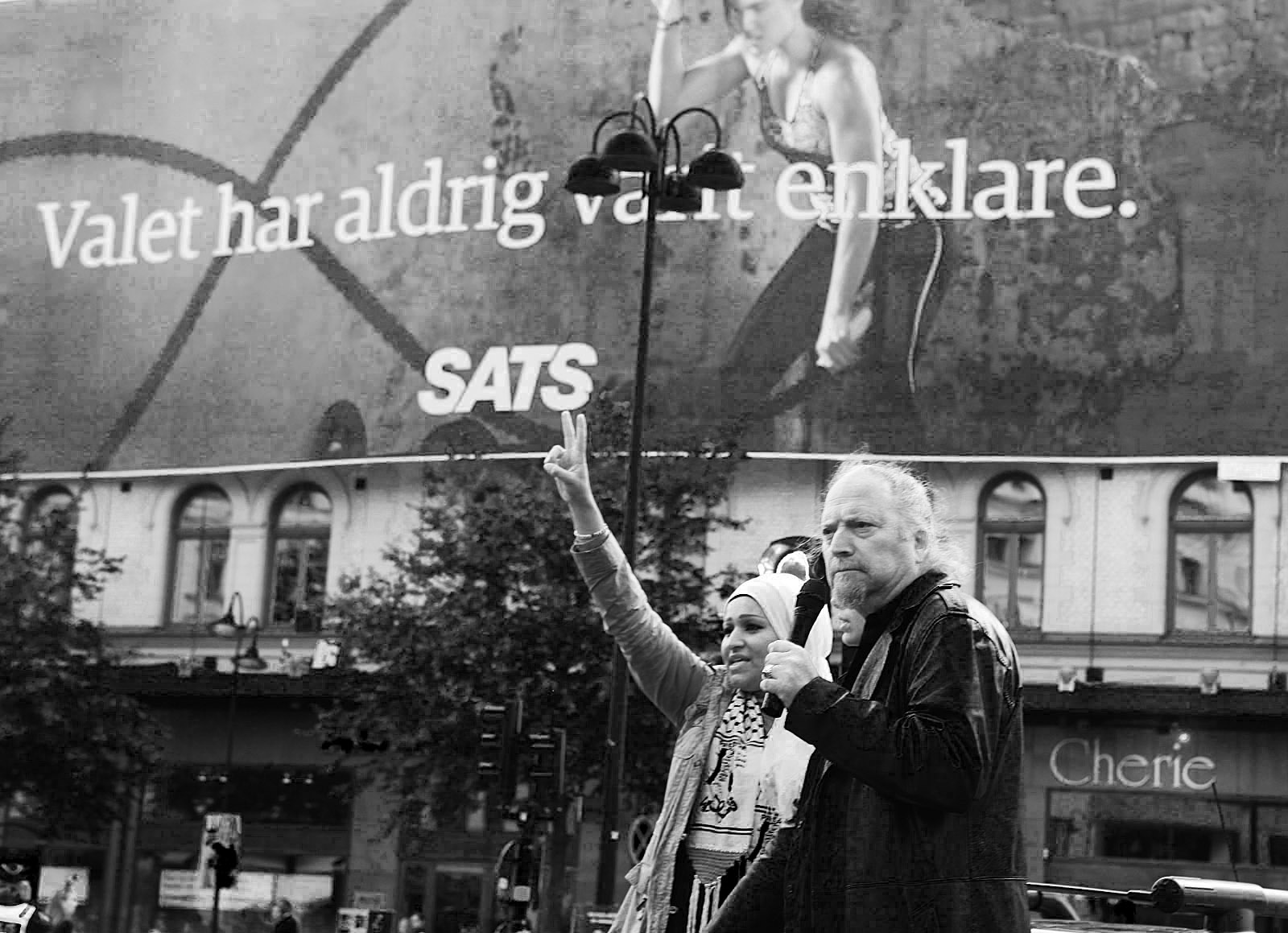 Dror Feiler leder talkören vid Palestinademonstrationen i Stockholm den 23 augusti. Inte så många deltagare den här gången, men en naggande god manifestation till stöd för palestinierna mot Israels ockupation och ständiga mördande. Fina tal av bla (v):s Selnah Alsaati och Yvonne Ruwaida, "miljöpartist men inte representerande partiet". -- Men ännu ingen partiledare eller regeringsledamot i talarstolen! De dyker väl upp nästa söndag (31 augusti) när Sionistiska federation i Sverige anordnar en manifestation i Stockholm till stöd för Israel och dess bombningar!