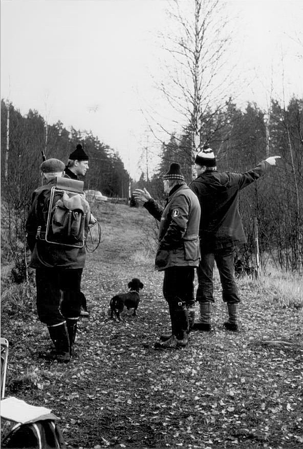 Tills dess får det bli ännu repris på en gammal bild, från den 5 november 1976. Morfar, med ryggsäcken, det här var hans sista jakt, han dog sen på vintern, Sture, Jimme och David diskuterar åt vilket håll djuret gick. Och Sofie, tror jag hon hette, taxen, som tycks peka ut en tredje riktning. Antagligen hade hon rätt, man ska lita på hundarna! (2014-10-16)