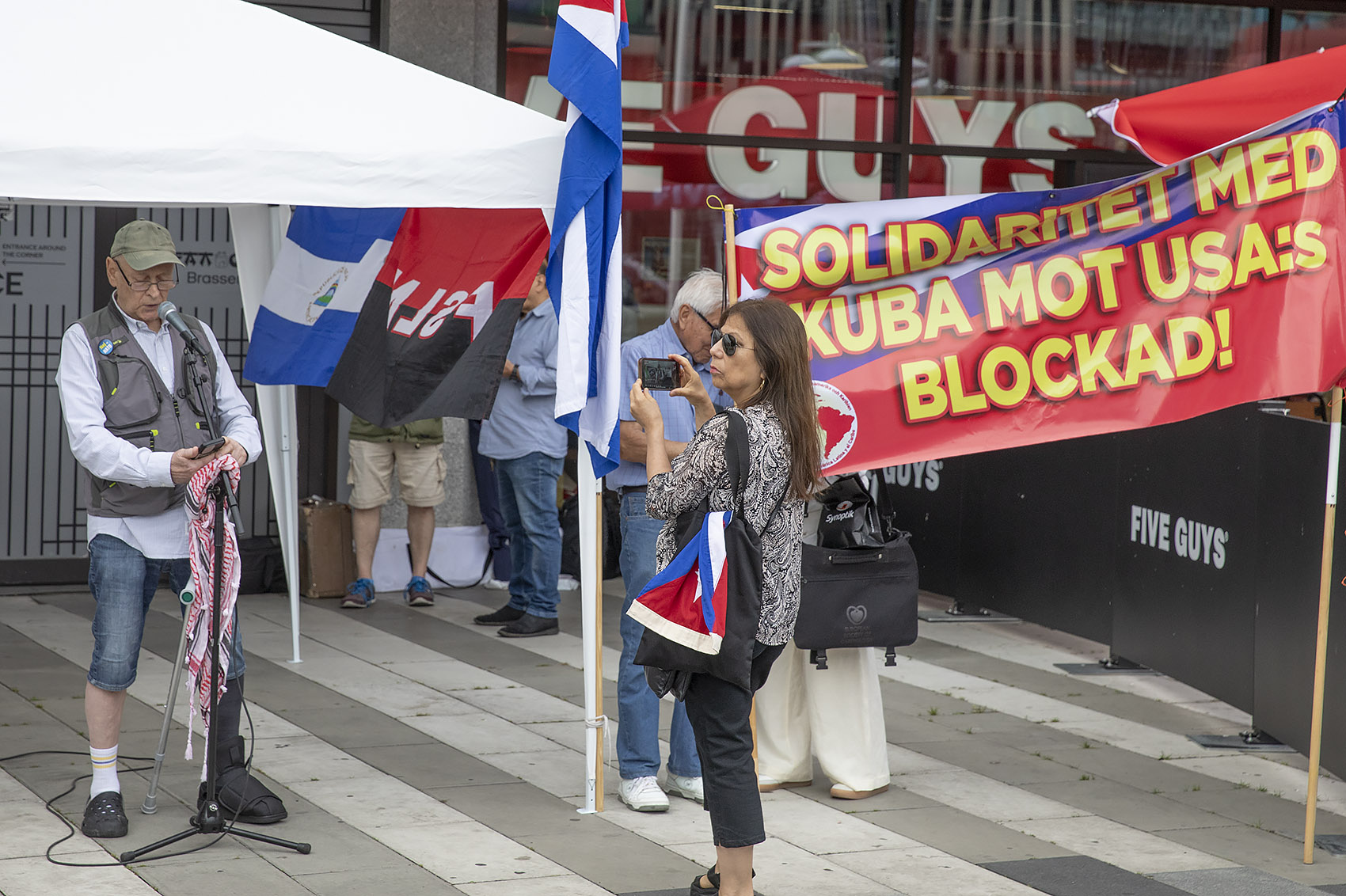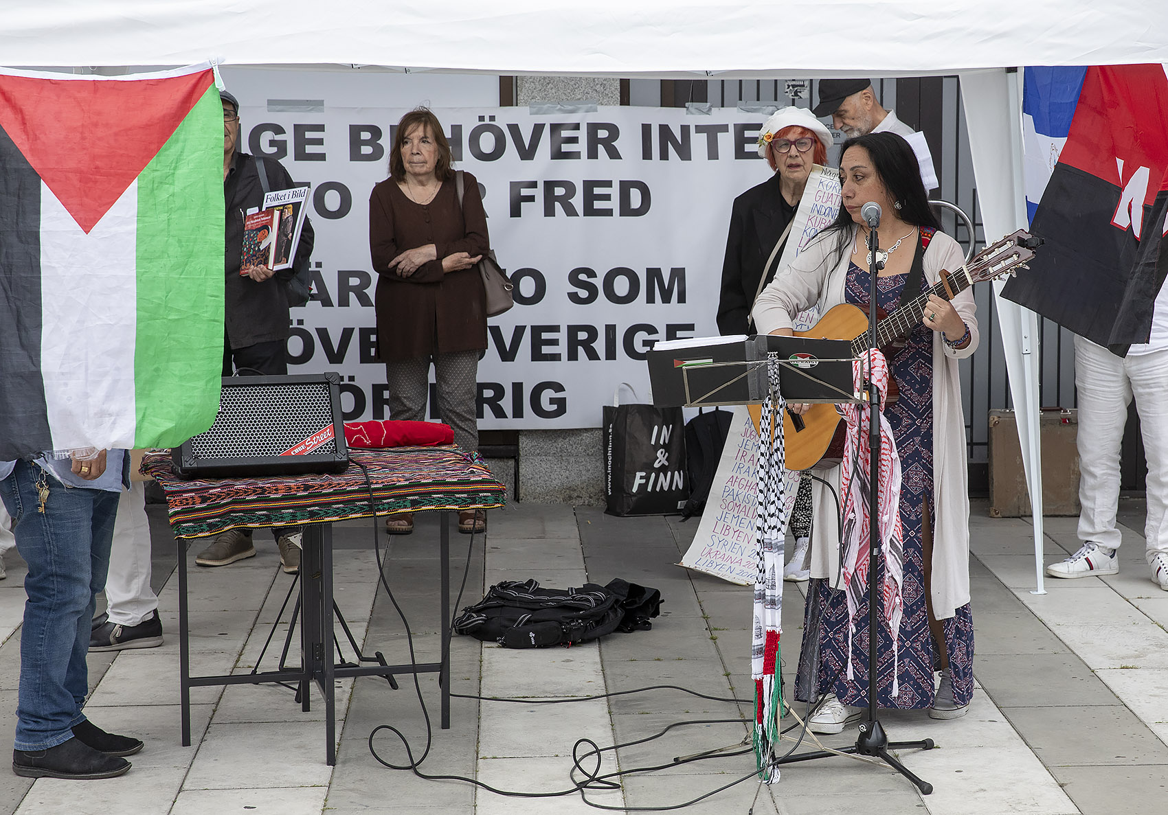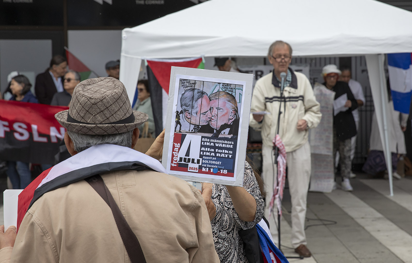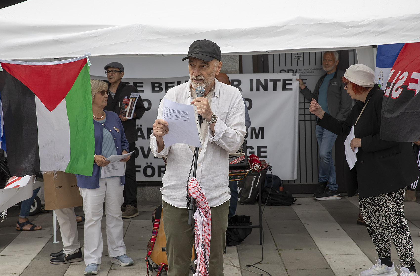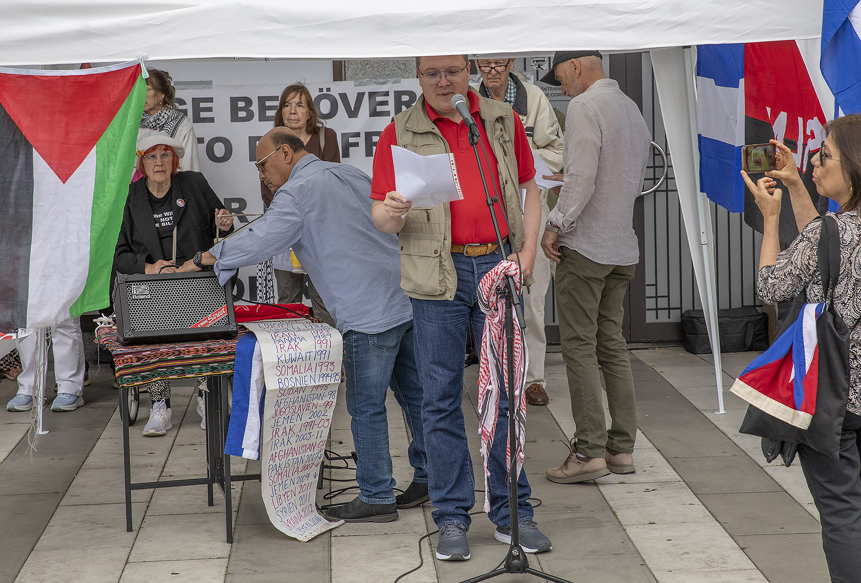 Ännu en kraftfull demonstration i Stockholm till stöd för palestinierna! Och LO:s ordförande Johan Lindholm höll tal vid det avslutande mötet på Gustav Adolfs torg! Nu får man bara hoppas att han slipper den skit som miljöpartiets Daniel Helldén råkade ut för efter att ha hållit tal på Odenplan förra lördagen. Beundrandsvärt av honom! Liksom hans riksdagskollega som talade vid den förrförra demonstrationen. Nu väntar vi bara på att socialdemokraternas och vänsterpartiets ledare också vågar stå upp vid någon av dessa manifestationer! Sedan får de ta risken att reptilorganisationen Judiska centralrådet kör en guilt by association-anklagelse därför att någon tidigare talare på Odenplan sagt något som de inte gillar. Dessa kräk som anklagar andra men själva slipper frågan hur de ställer sig till det israeliska folkmordet. Vi var många tusen ikväll med en röd ton i klädseln och drog en röd linje: Nu får det vara nog!
