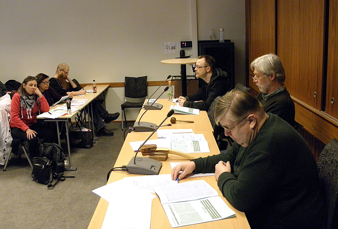 Maria Genou och Clas Eriksson presenterar de nominerade. Framför dem mötesordföranden Janne Alvebäck.