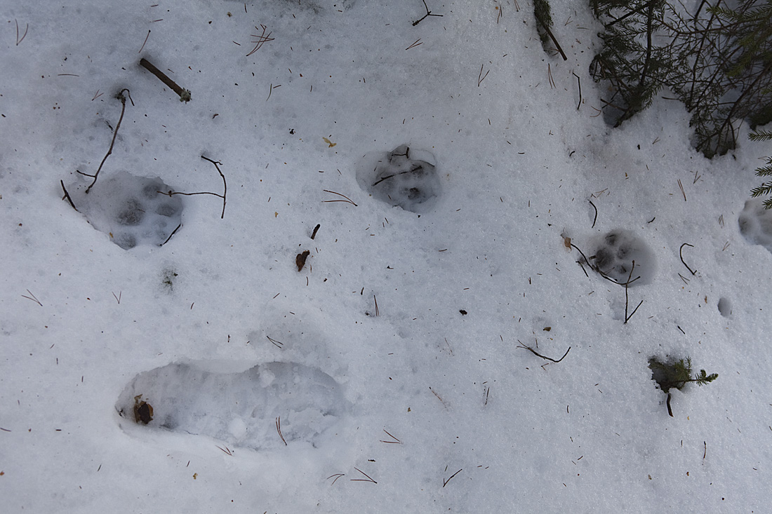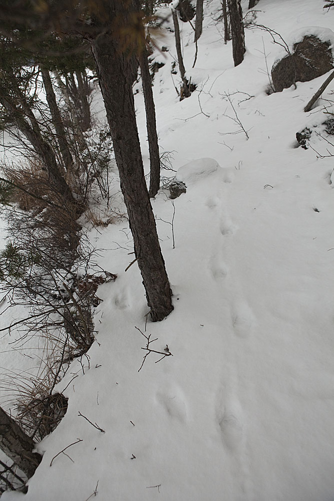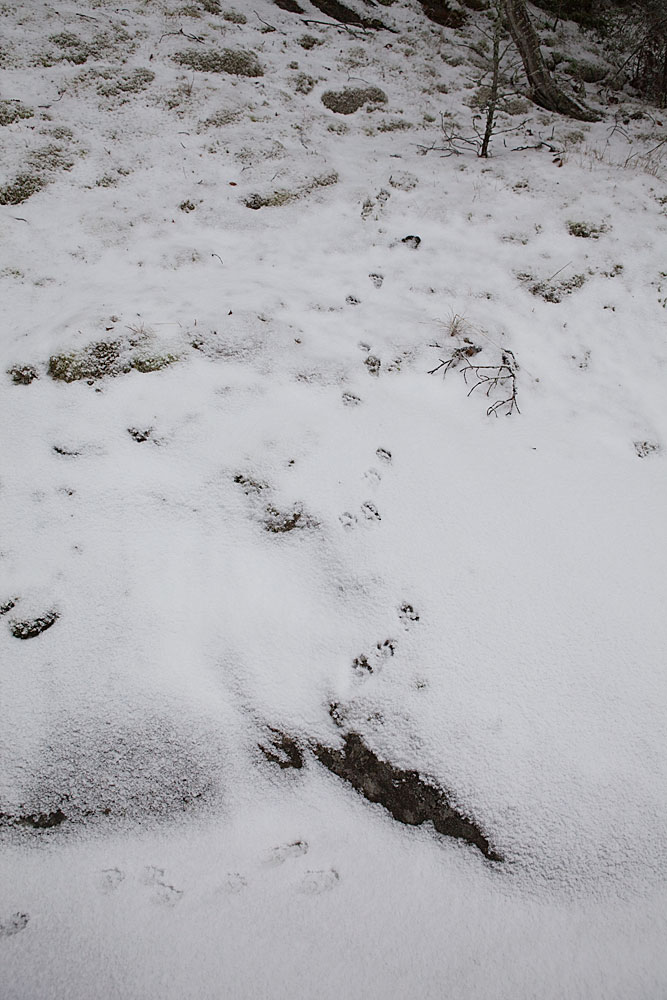 Den har gått över en liten tallmosse upp i berget med spänst i stegen, men utan att direkt ha jagat något djur. Kanske ett sätt att försöka skrämma upp de rådjur som finns i området?