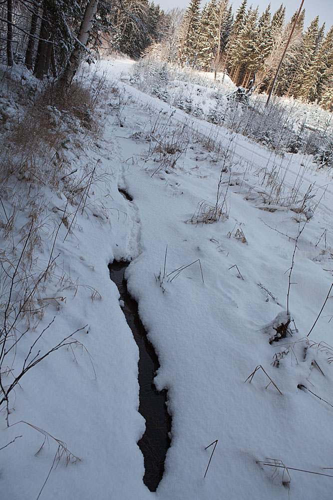 Verkligen inget krondike, utan ett litet dike som kommer uppifrån skogen. Märkligt att den långa sträckor kunnat ta sig fram under isen i det grunda vattnet!