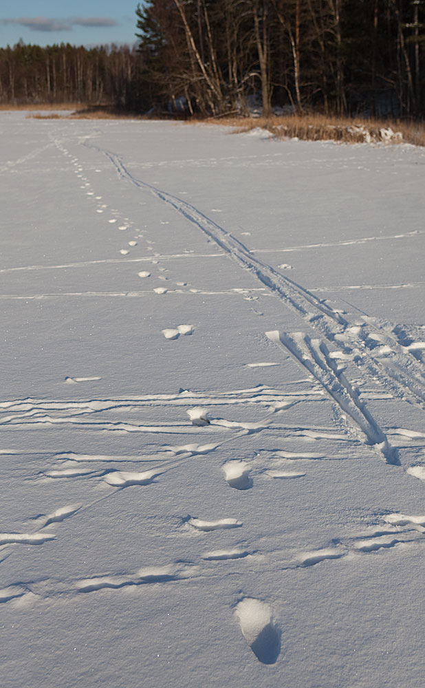 En fin vinterdag i Roslagsskogarna, med ner mot minus tio på morgonen och bra skidföre på sjöar och skogsbilvägar. Några dagar sedan senaste snöfallet så det var gott om spår i skogen. Mård på flera ställen, hermelin/småvessla likaså, älgar och även rådjur. Och grisar. Hare och räv förstås, och någon enstaka ekorre, inte så gott om dem i vinter. Och så varg igen. Nu verkade paret vara tillbaka och här har de sprungit tillsammans längs sjön vid Torpet i skogen. Dessutom ett översnöat rävspår -- för att kunna få en uppfattning om storleken! 2012-01-29