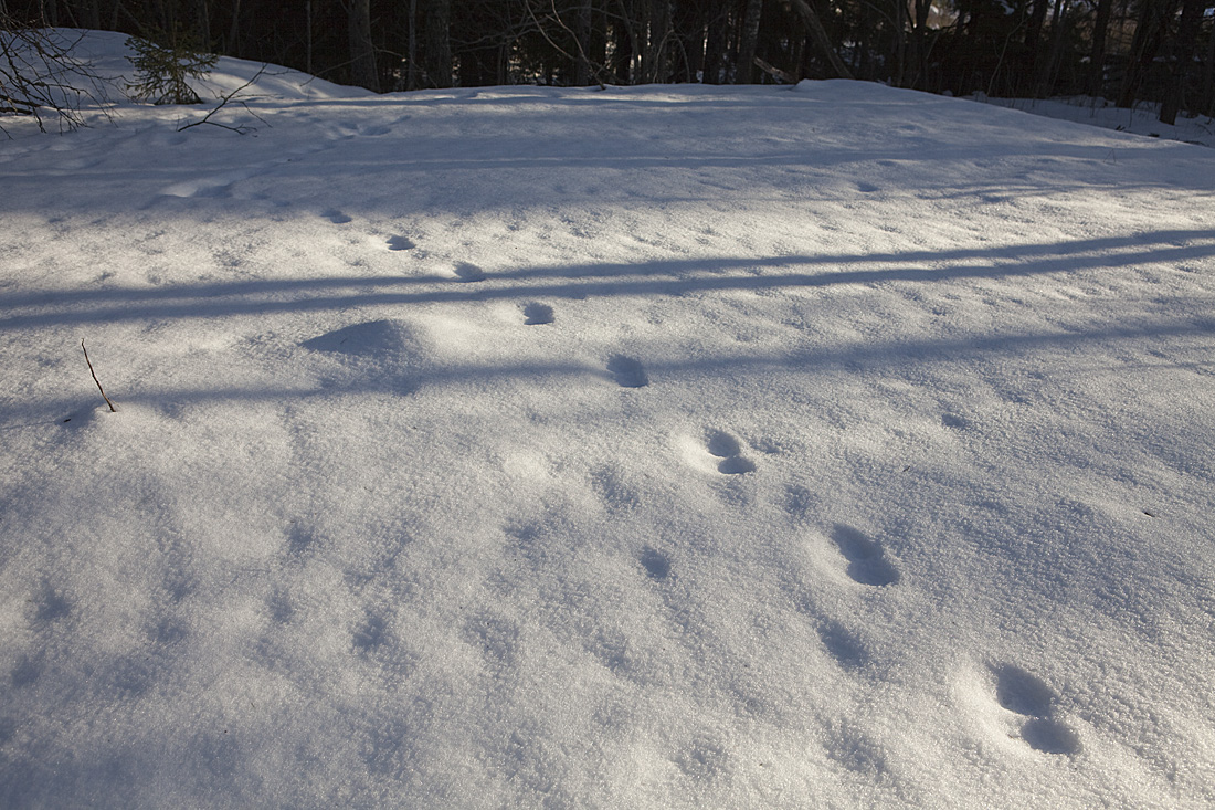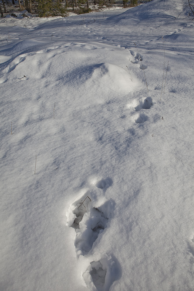 En hare längs vägen. Haren är aldrig särskilt talrik i de här fattiga markerna, men man ser spår efter dem här och där. Även relativt gott om rävspår och ekorre under dagens vandring. Men inte ett enda mårdspår. Det säger inte så mycket eftersom mården är litet lurig: Ena dagen ser man inte ett spår och nästa dag har de passerat vägen på de alla de vanliga ställena.