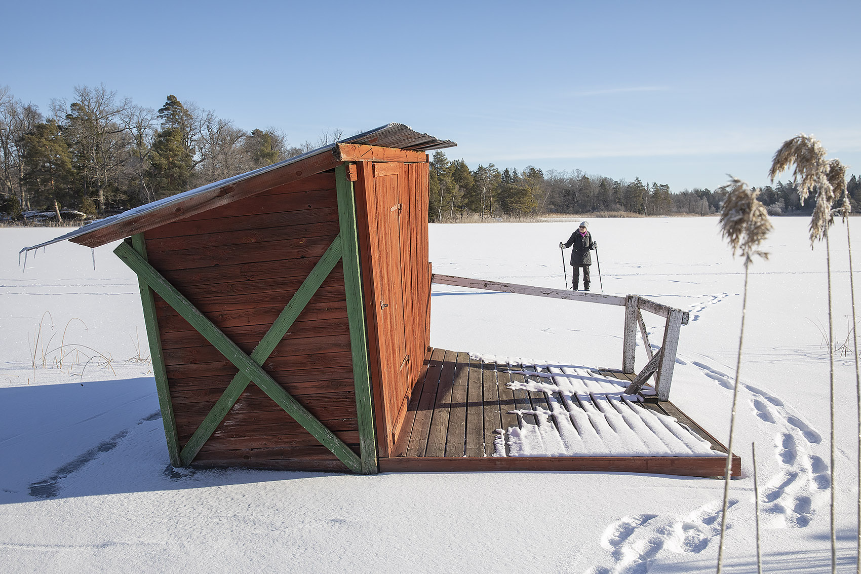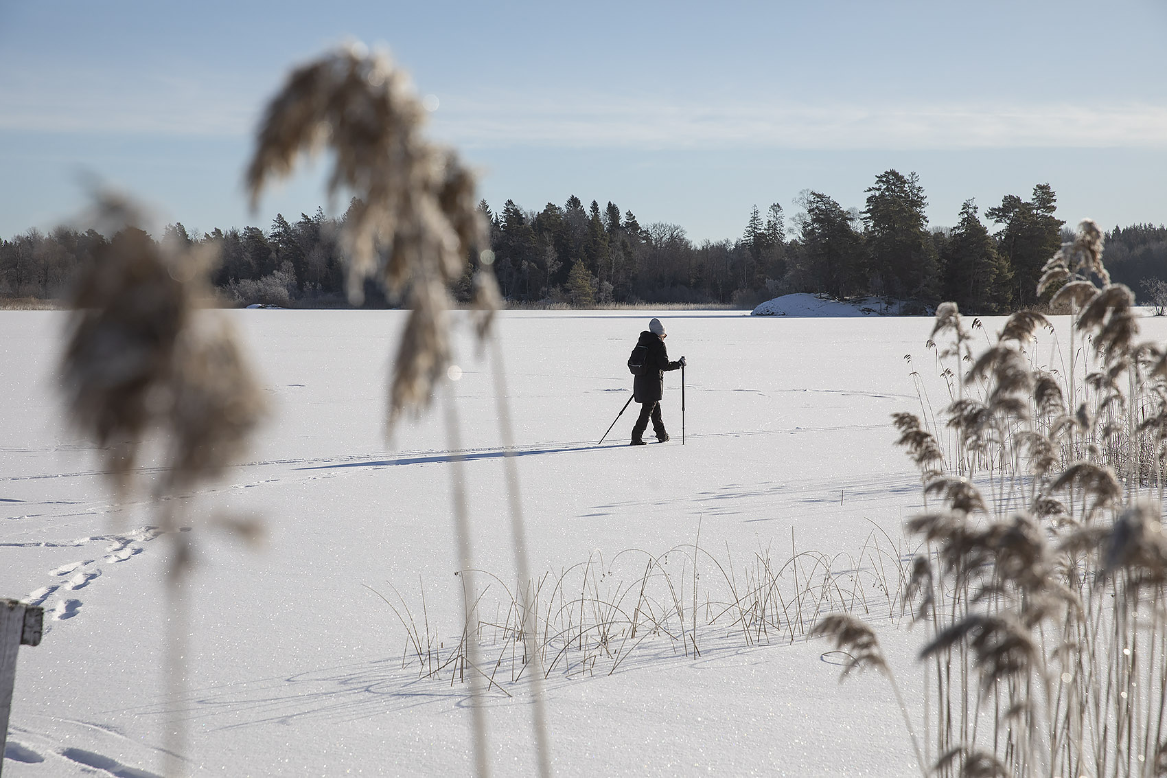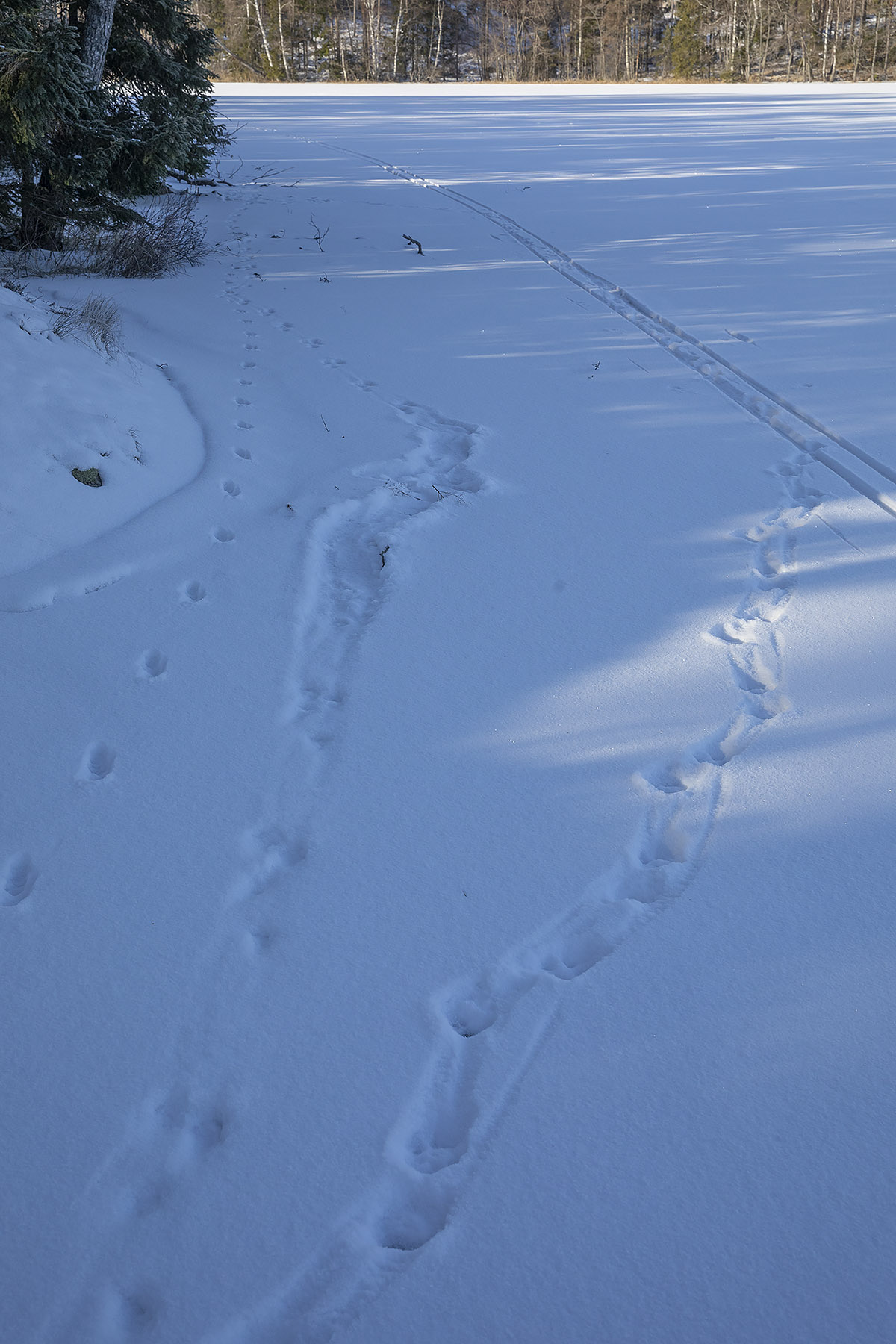 Det var då det. Idag sken solen hela dagen, det var -19 grader när vi kom ut och ett underbart väder att gå på isen. Man hade kunnat åka skidor, men dem hade vi lämnat hemma. Så många spår! Skridskoåkare förstås, ett helt gäng hade åkt runt sjöarna i lördags och några fiskare hade också varit ute. Och den bästa fiskaren av alla, uttern, hade sprungit längs sjön den natt som det snöade. Det är – dessvärre – gott om mink och deras spårstämplar syntes, både äldre och nattfärska, runt hela sjön.