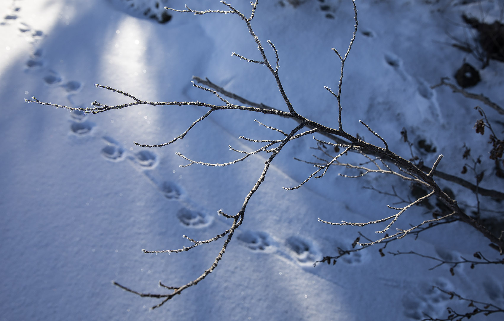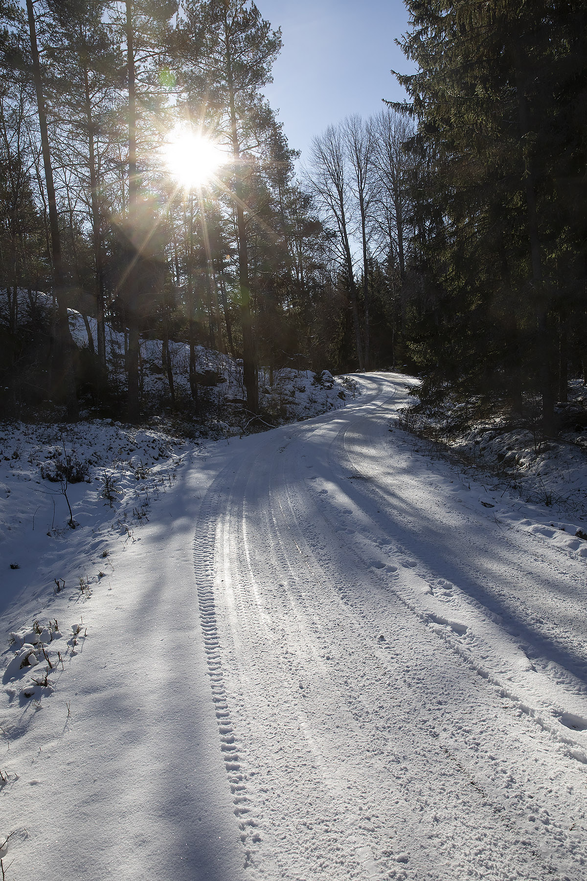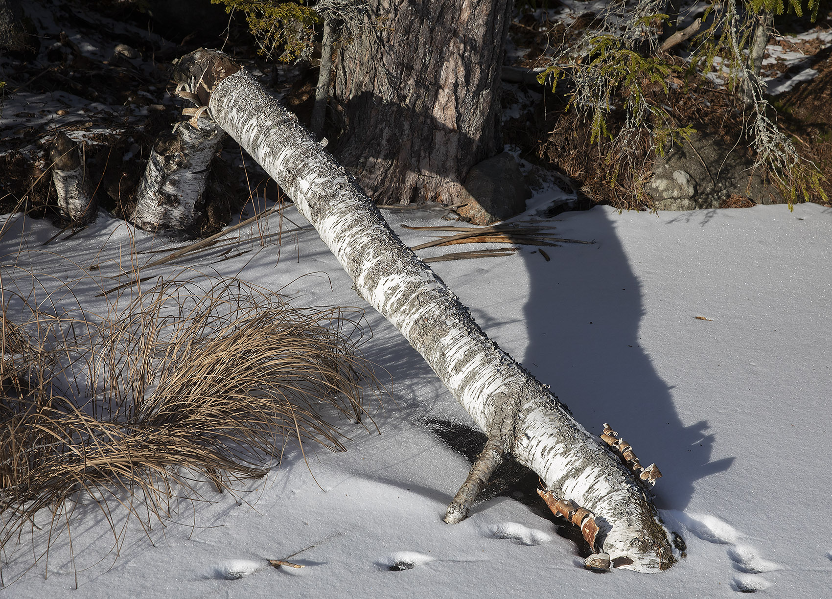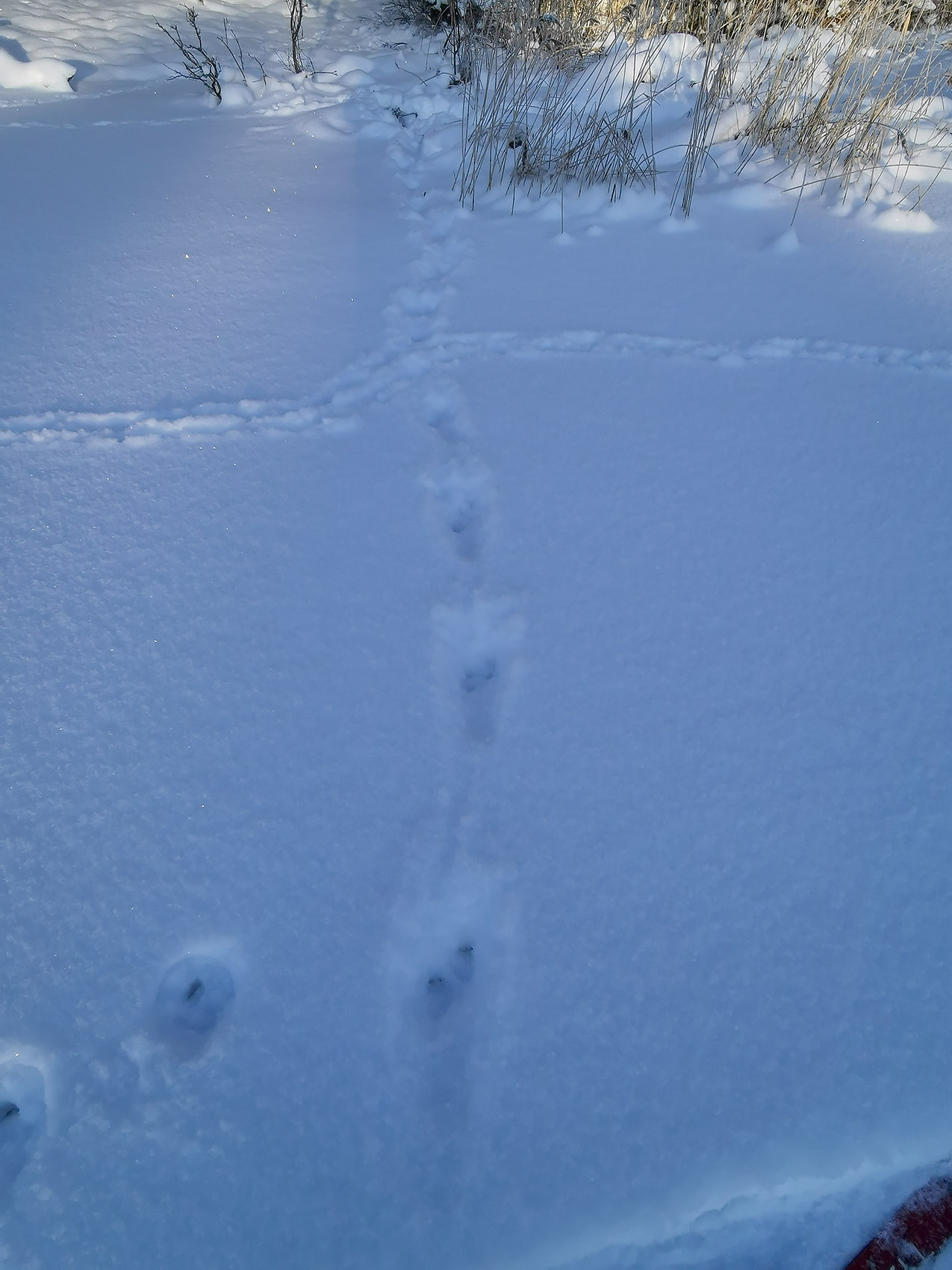 Det var då det. Idag sken solen hela dagen, det var -19 grader när vi kom ut och ett underbart väder att gå på isen. Man hade kunnat åka skidor, men dem hade vi lämnat hemma. Så många spår! Skridskoåkare förstås, ett helt gäng hade åkt runt sjöarna i lördags och några fiskare hade också varit ute. Och den bästa fiskaren av alla, uttern, hade sprungit längs sjön den natt som det snöade. Det är – dessvärre – gott om mink och deras spårstämplar syntes, både äldre och nattfärska, runt hela sjön.