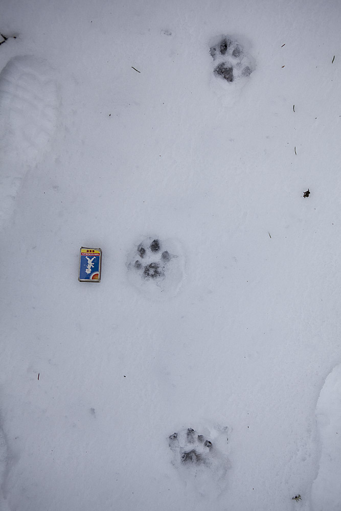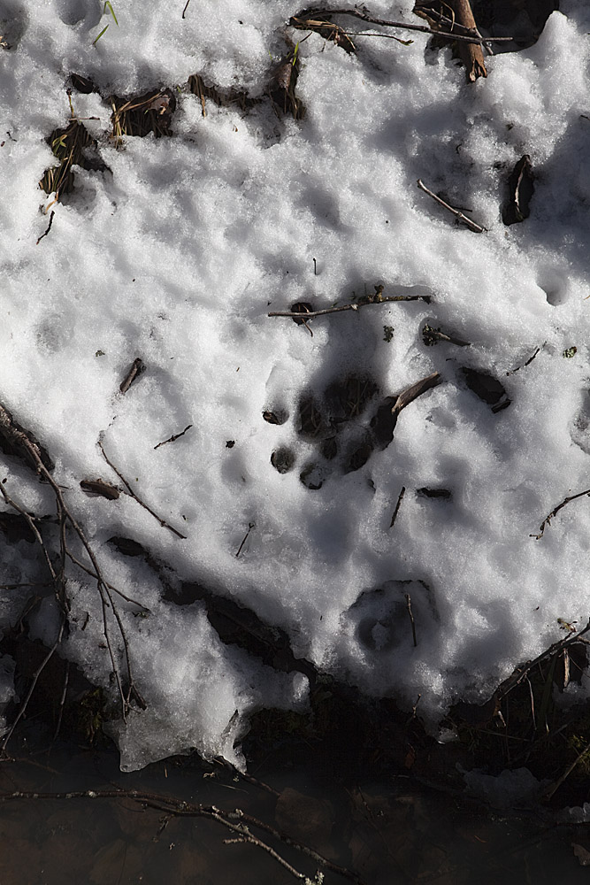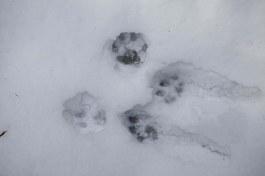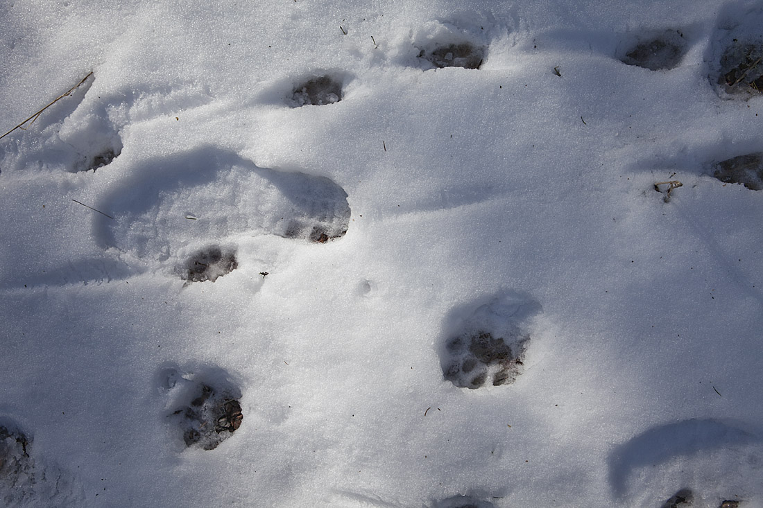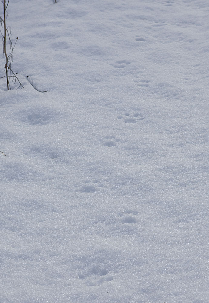 När den går på skarsnön blir spåren små eftersom det bara är trampdynorna som sätter avtryck. I lös snö kan man, om man är litet slarvig, förväxla lospåren med vildsvin och t.o.m en liten älg, på grund av att den är så hårig på tassarna och benen. Här ser man hur den i bortkanten på bilden har trampat igenom skaren och spåren då blir av en helt annan dimension!