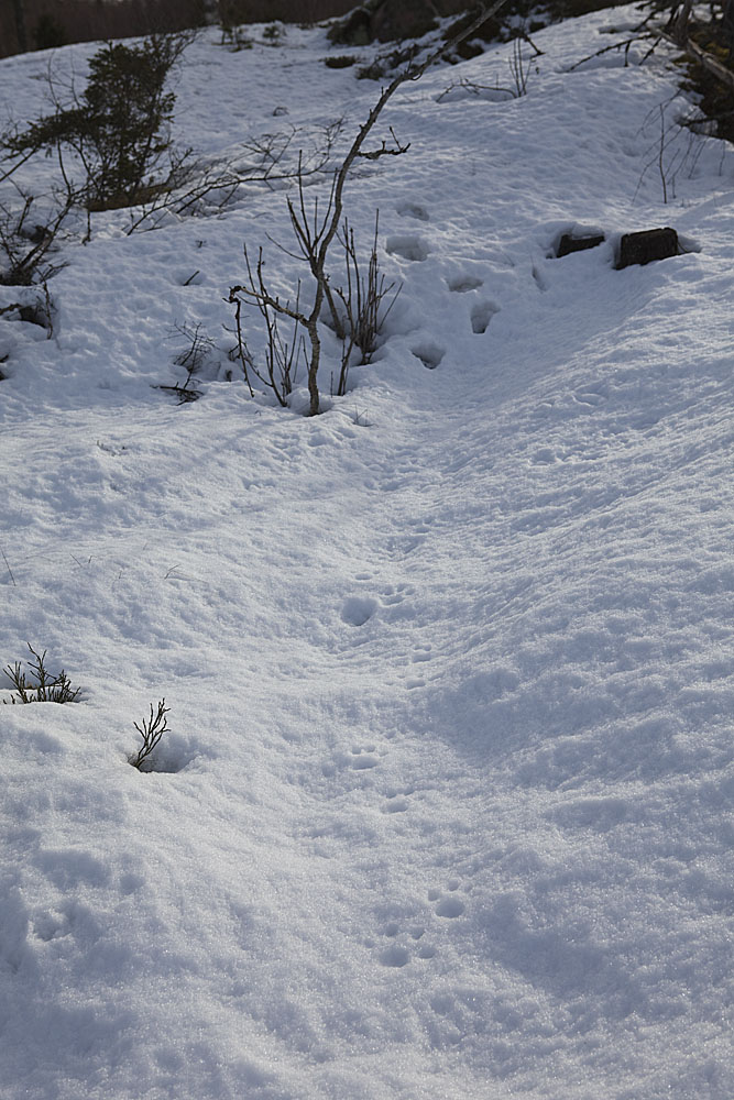 Vi följer morgonens spår en bit in i skogen, men tappar det. När vi fortsatt en bit till korsar vi ett (nytt) lodjursspår. Det verkar vara litet större, men rimligen är det samma djur som gårr en sväng upp i bergen och ner igen -- men spårsnön är för dålig för att det ska gå att avgöra, i varje fall med den tid som vi har till förfogande!