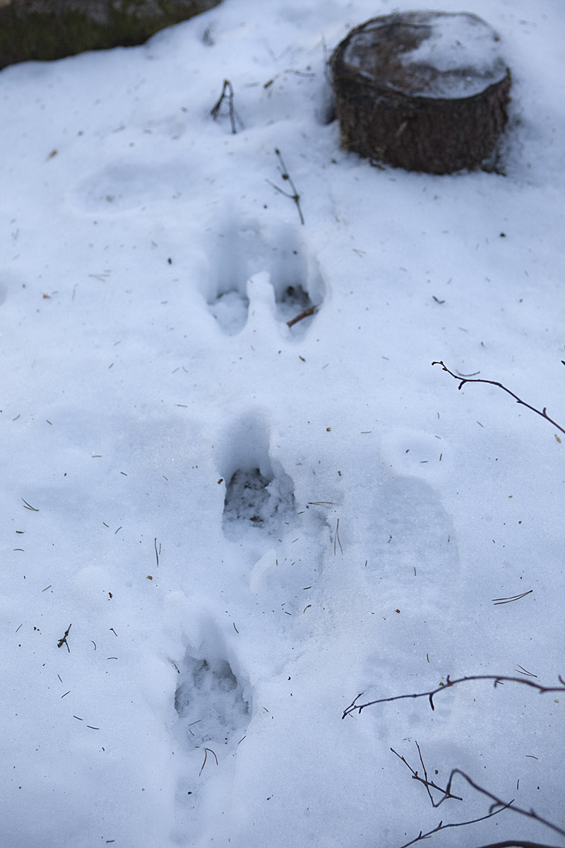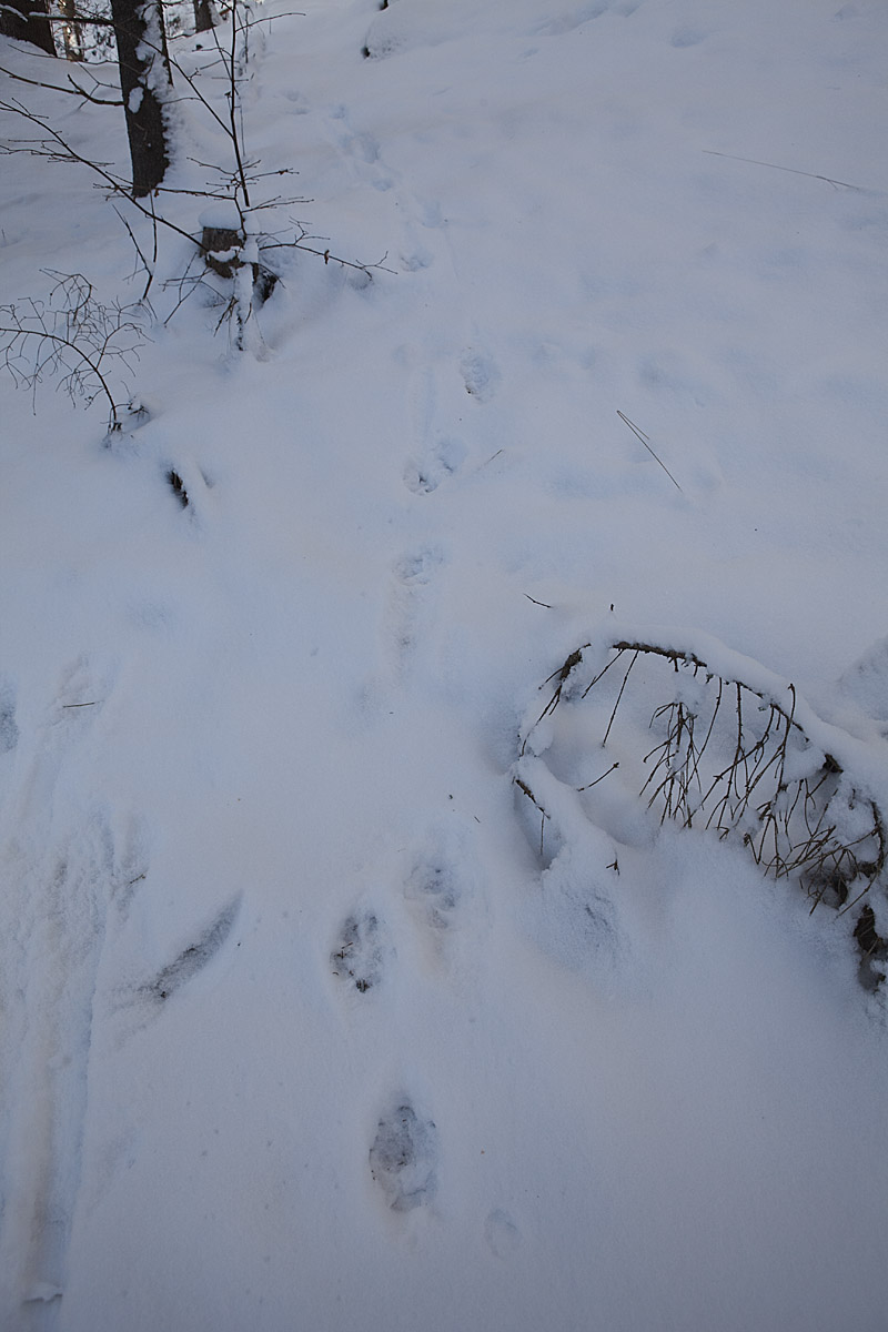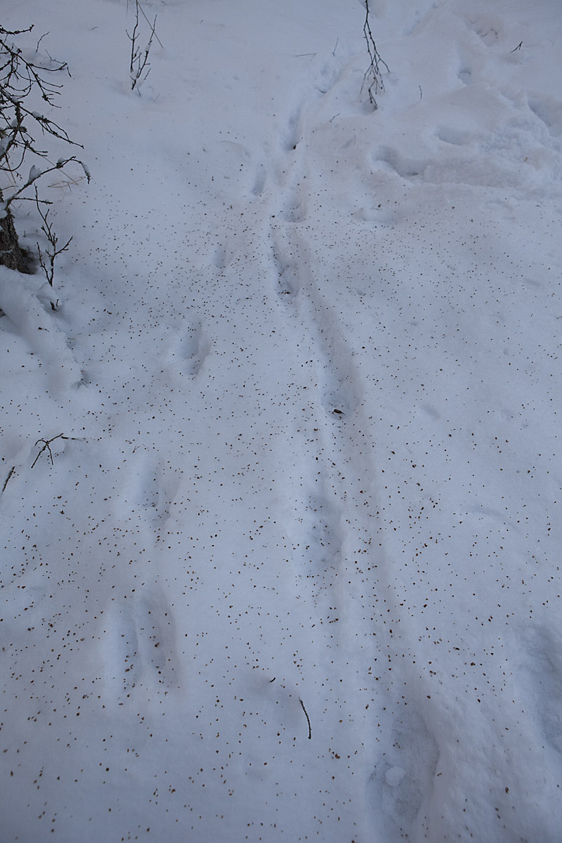 ... och här har järpen varit framme. I samma område som jag såg spåren den 14 januari. Järpen är lika ovanlig som tjädern i dagens skogar.