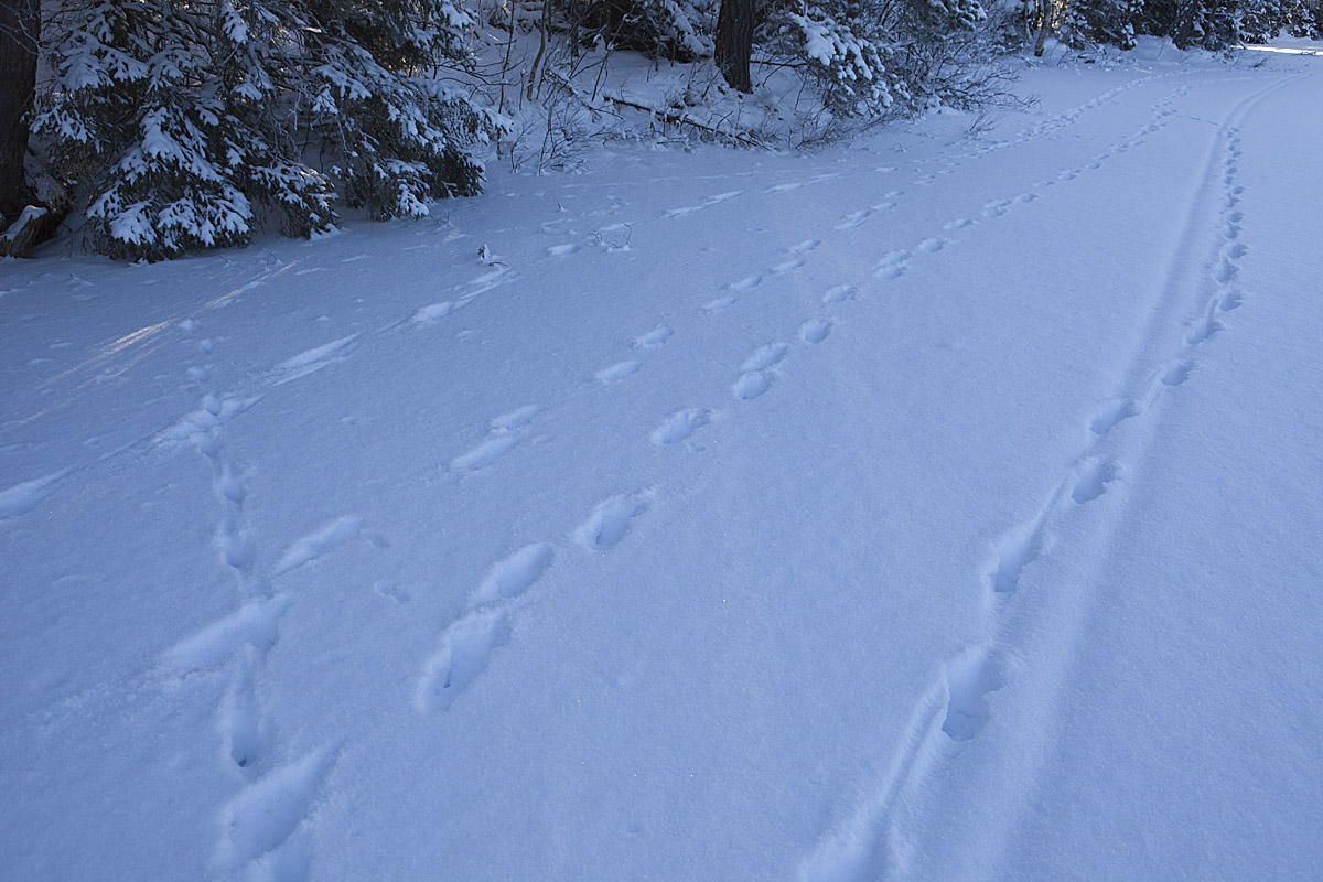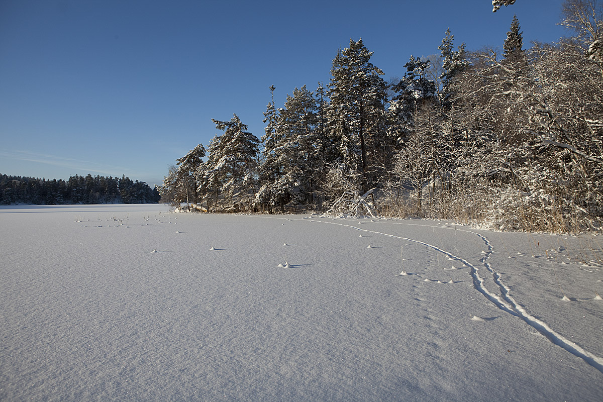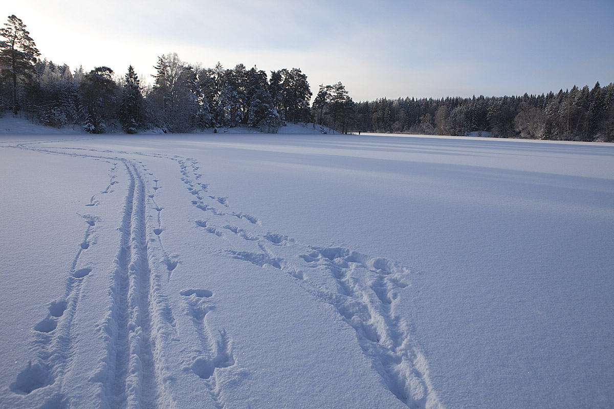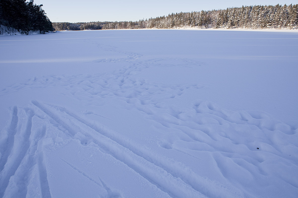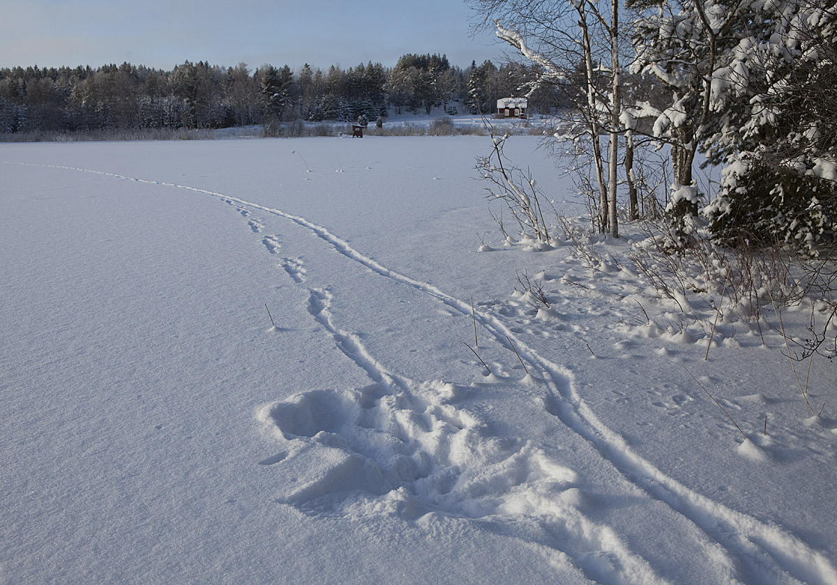 Ett spår som jag inte är riktigt säker på. Det stora nederst tv i bild är en av de tre älgar som gått över sjön, men det till höger? Antagligen en mus/sork som också gett sig ut på isen och gått över till andra sidan och med jämna mellanrum gått upp för att ... ja, vadå?