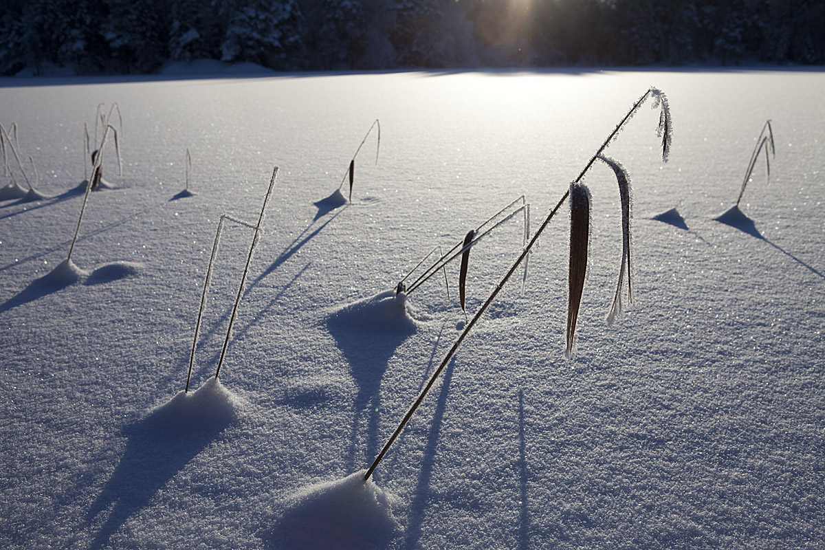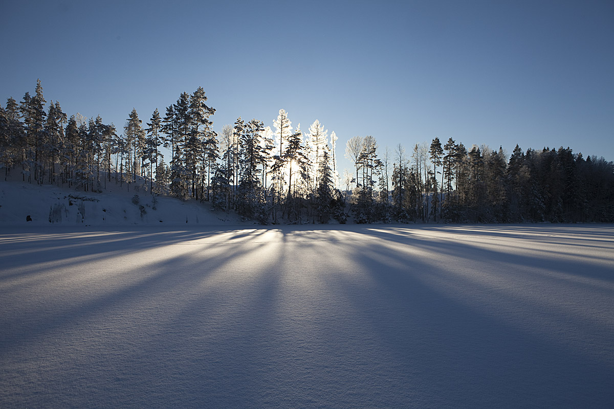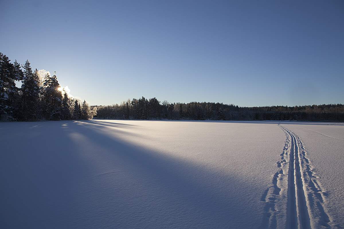 Ännu en riktig vinterdag! Minus 19 grader när jag börjar min skidtur och solen är på väg upp över den första sjön. 2013-01-22.