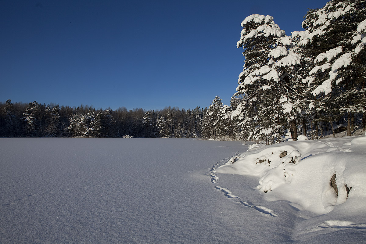 Det blir mest vinterbilder den här gången! Här den vackra tallen vid nästa sjö, där man fikat så många gånger, inte minst på den tiden då det fanns en rimlig chans att höra pärlugglan ropa i de här skogarna ...