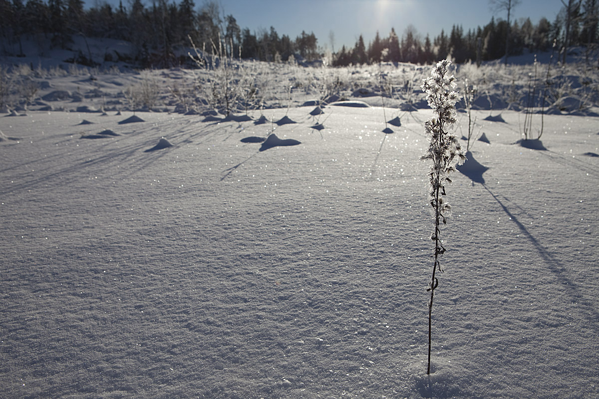 Jag lämnar spåret för den här gången och åker av sjön och tvärs över det stora hygget. Här en vinterståndare av björnloka som överlever ännu några år. Här stod en gammal kulturskog med en rik undervegetation i sänkorna.