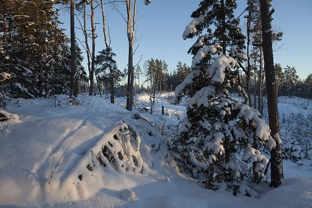 Vi avslutar dagen så som vi inledde den, med litet lodjursspårning -- av samma djur dessutom. Den har kommit söderifrån och jag kommer på spåret i skogen mellan två sjöar. Det har fortsatt norrut i samma bana som jag spårat lodjur tidigare. Jag har inte tid att följa längs spåret hela vägen utan gör "stickprov" där jag antar att den har gått, och det stämmer. Här har den kommit på ett stort hygge och på lodjursvis sökt sig upp på höga positioner och nu är den på väg ner från bergen i ena kanten av hygget ...