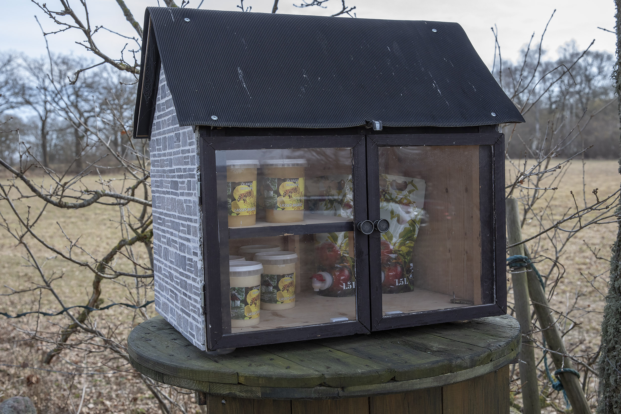 Lasses bigård i Stenninge hade satt upp ett skåp vid Södra Greda löväng där man kunde köpa honung och äppelmust.