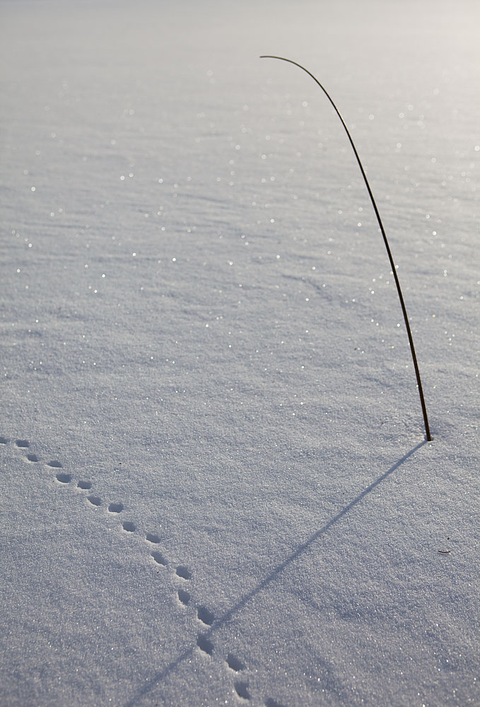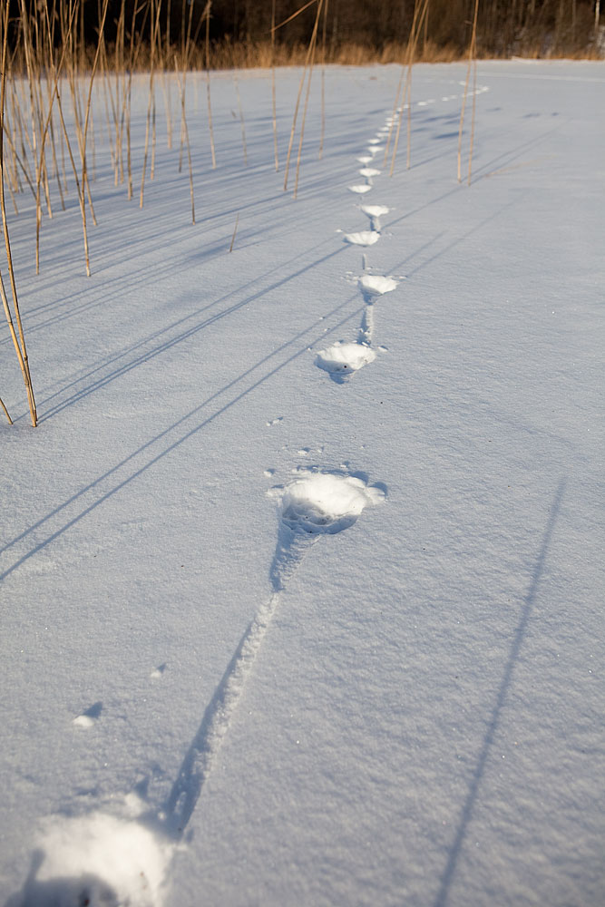 En mus eller sork har just inlett sin långa vandring på isen tvärs över sjön! Jag skrev om det i berättelsen Spår i snön.
