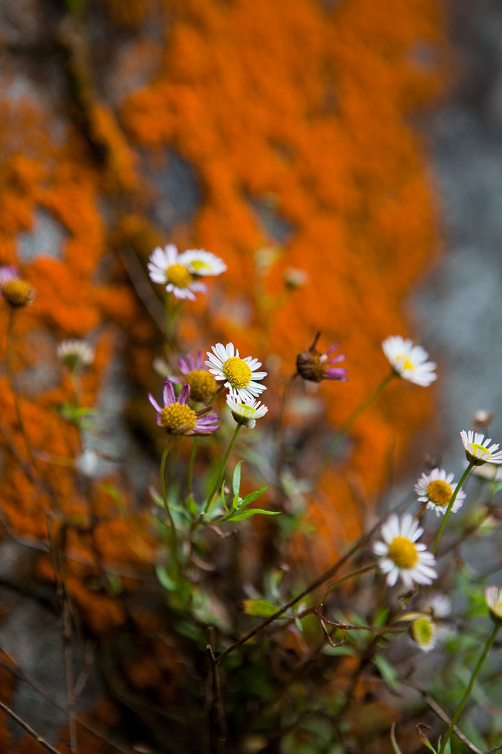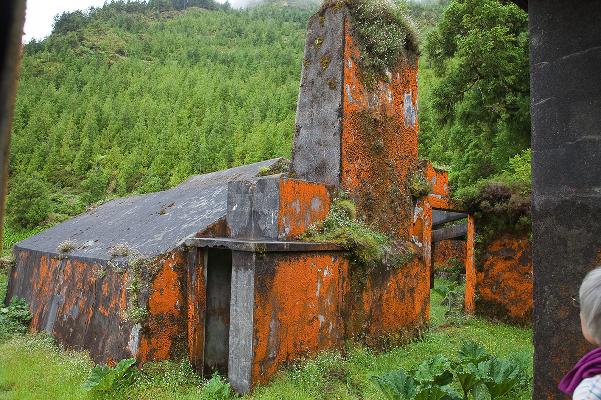 I det fuktiga klimatet trivs lavarna som färgat hela anläggningen i en stark orange färg ...