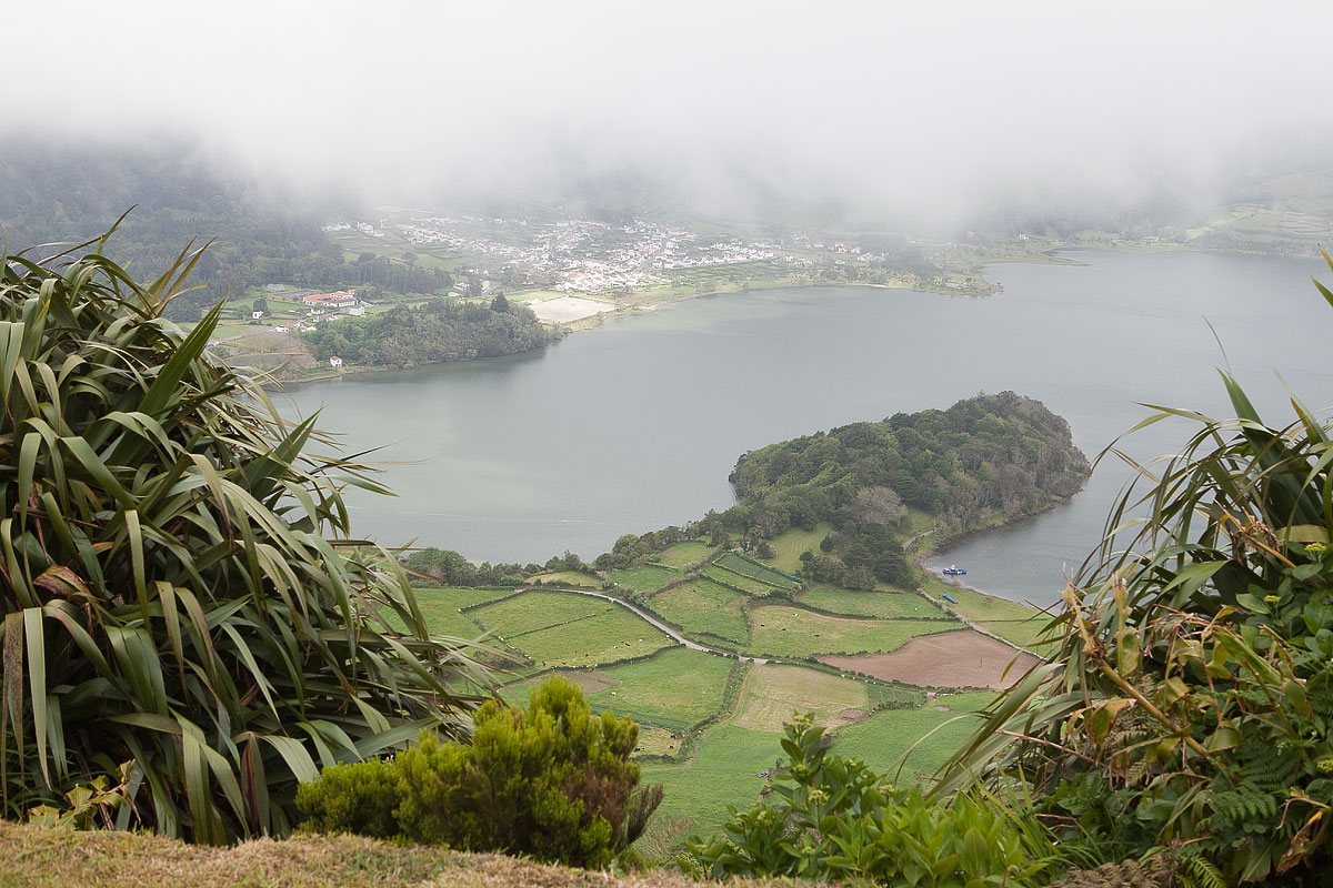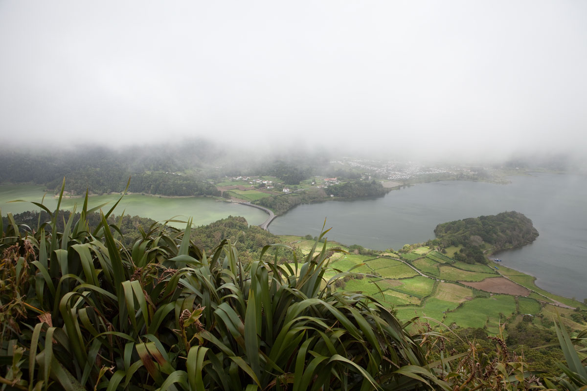 Så ligger då sjöarna framför oss vid Miradouro Cerrado das Freiras, den gröna och den blå. Säkert ännu mer markant de dagar som solen orkar ta sig igenom dimbankarna.