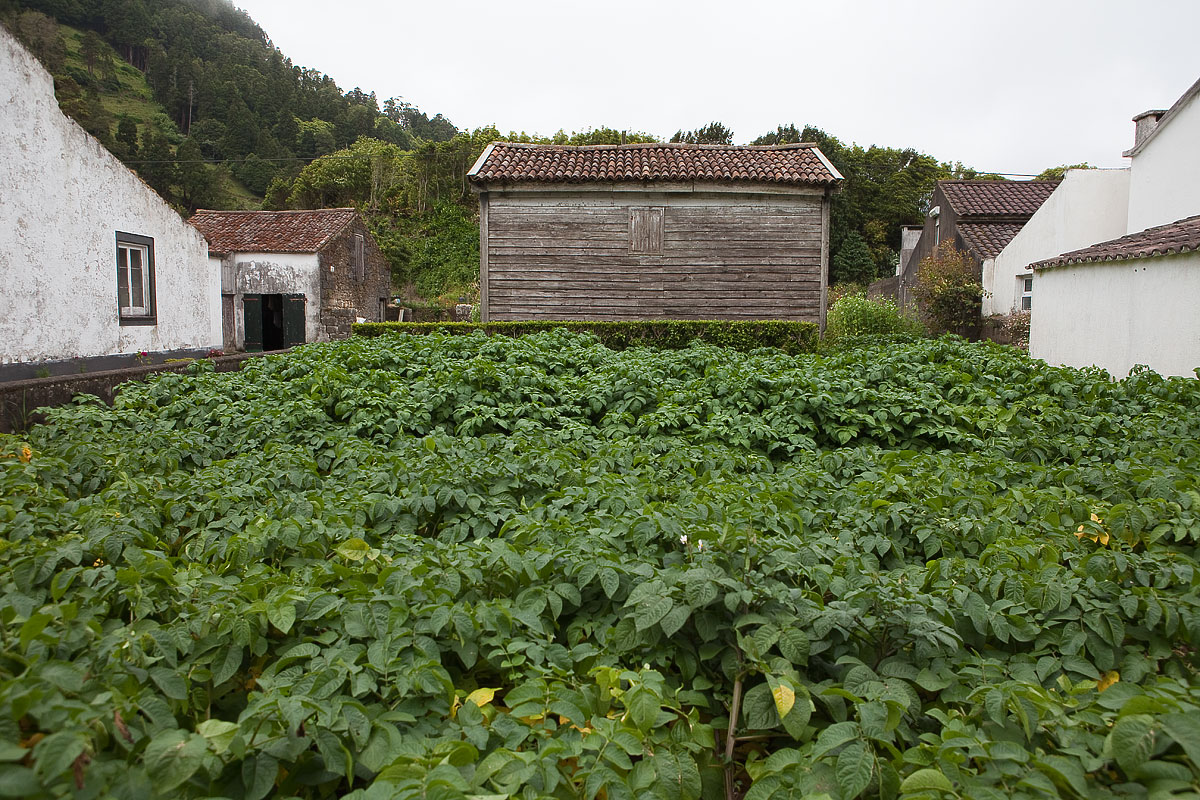Även här ett uthus av trä, och framför det ett rejält potatisland ....
