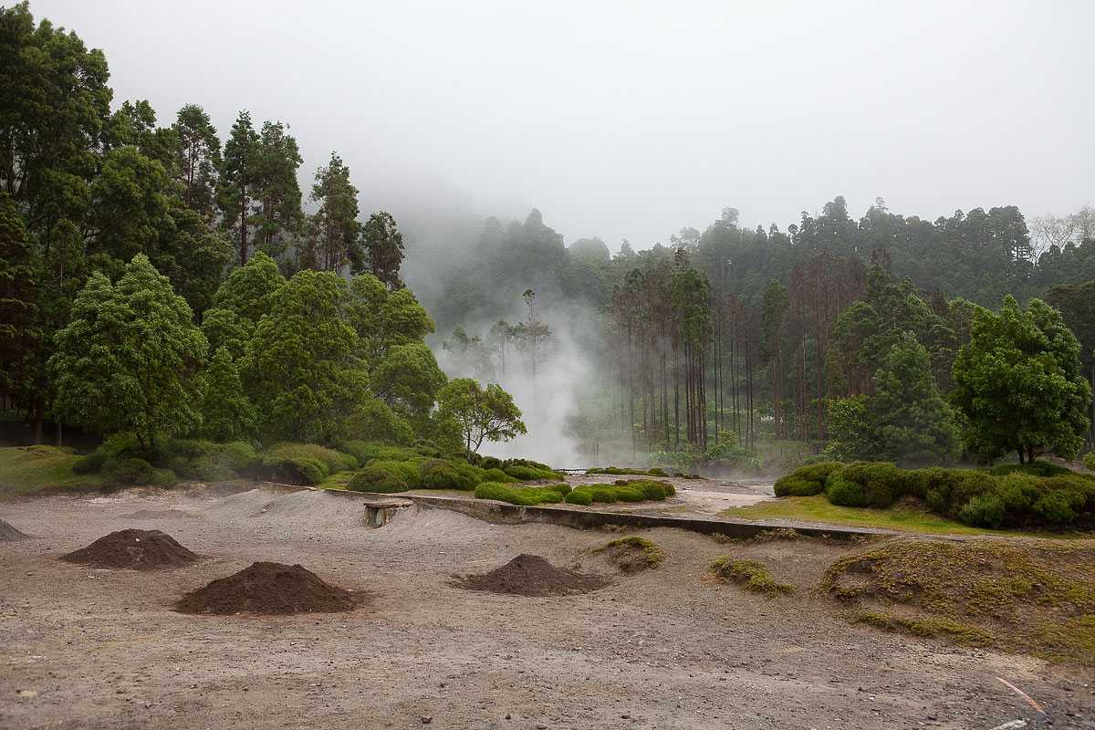 Vi hade tänkt oss en vandring runt sjön vid Furnas, men gav upp det i det dåliga vädret. Men kä'llorna kokade på, väldiga krafter som kan ge en liten aning om hur det är när de släpps fria på allvar. Här utnyttjar man dem för att koka mat i små brunnar och täcker över med grus under kokningen.