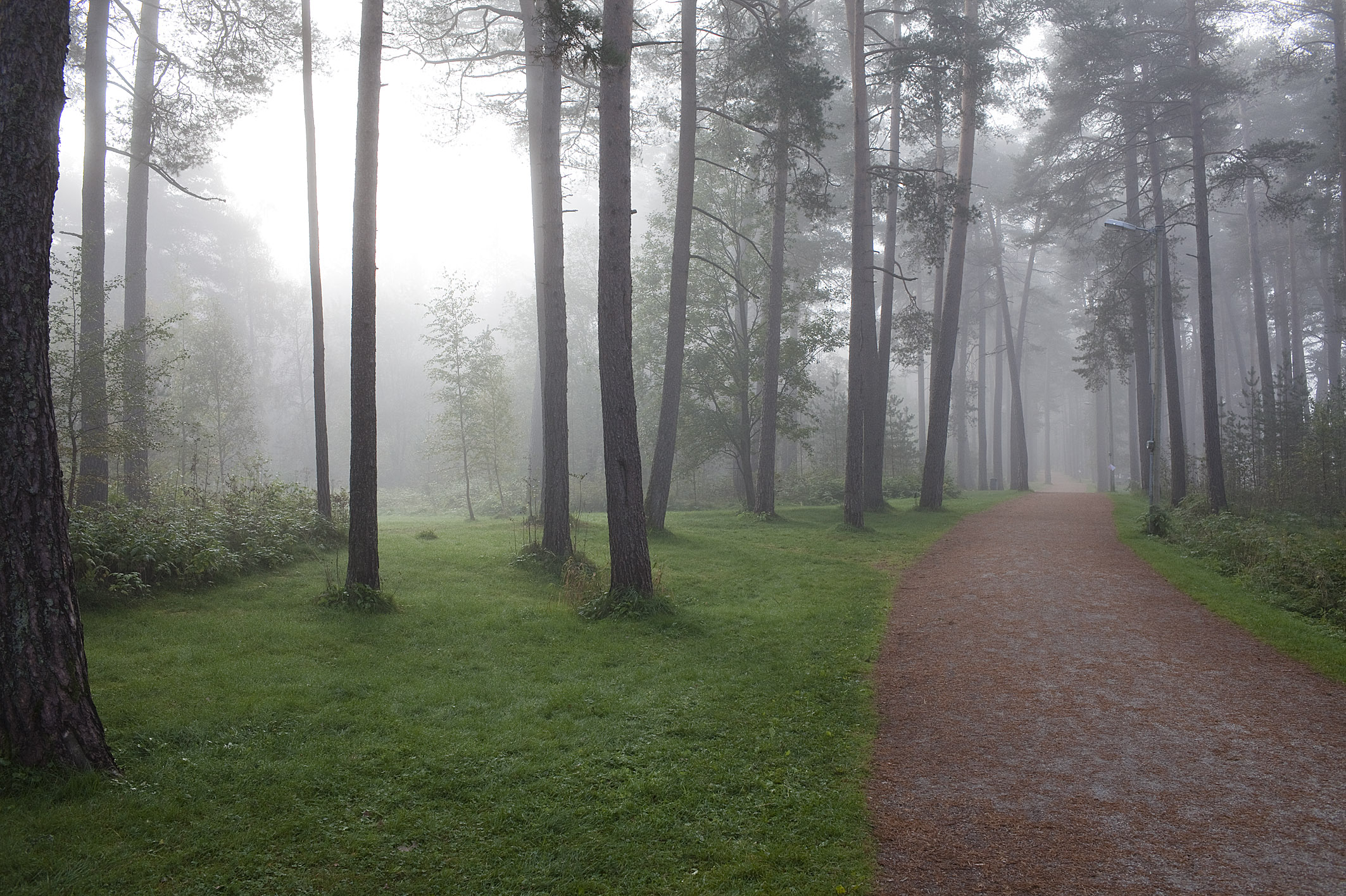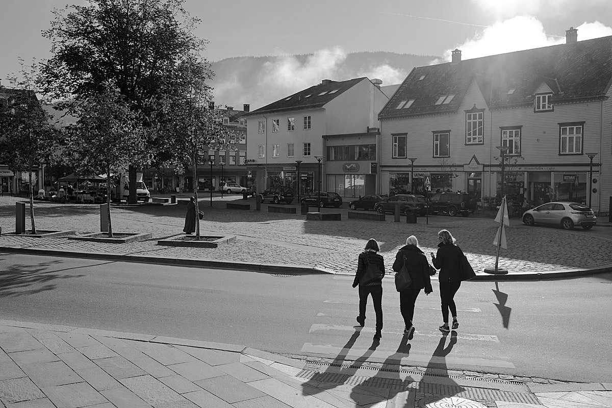 Bilder från Voss, första dagen: En dimmig morgon, men solen är på väg att bryta igenom på Prestegardsmoen. Som om de visste att jag behövde något att hänga upp dimman på, kom ett gäng skolungar löpande. Glada var de, och jag också. En fin morgon!