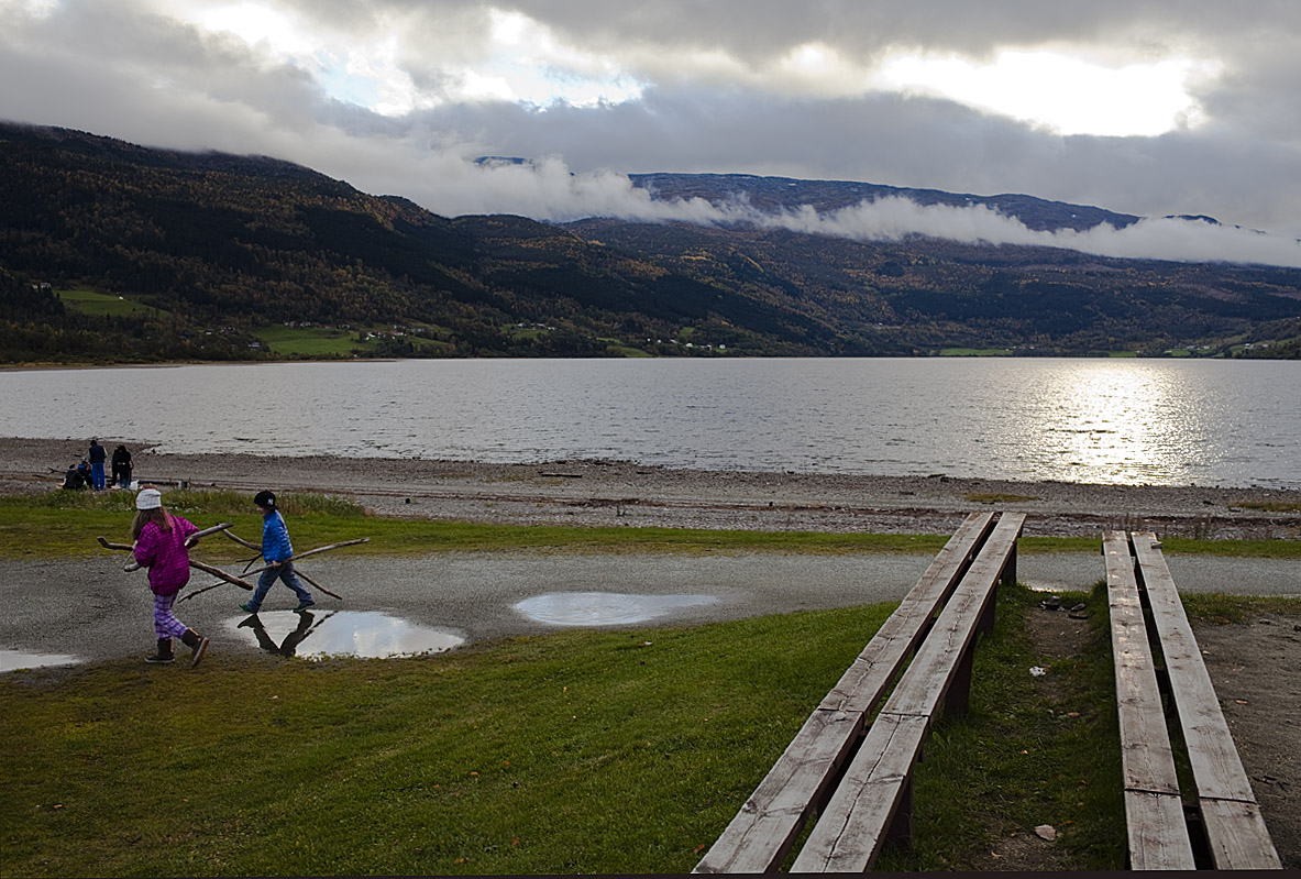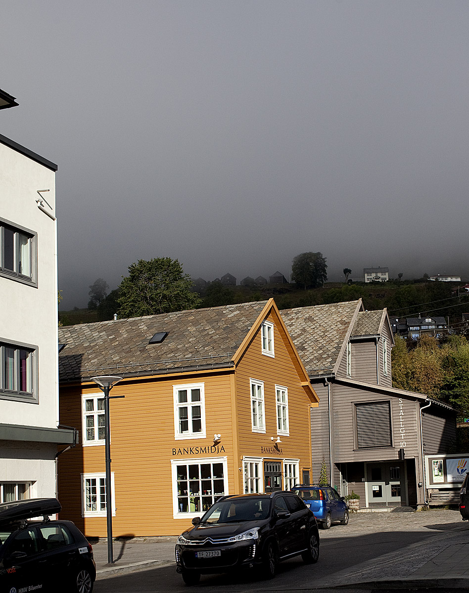 Bilder från Voss, andra dagen: Morgondimma idag igen och därefter sol, tredje dagen i rad. Det är ingenting man kan räkna med här på Vestlandet, även om det regnar mindre i Voss än i Bergen. I uppvindarna framåt eftermiddagen kommer tio skärmflygare seglande ner från berget; linbanan upp på fjället är stängd för mellansäsong, men de har fått åka med dem som underhåller liftarna. Hämtar barnbarnet på barnehagen – med en standard som får en fattig svensk att spärra upp ögonen! Men det är klart – nu får också norrmännen en reinfeldsk regering, förstärkt med några av Behring Breiviks partikamrater, så det ska nog bli ordning även på det norska torpet.