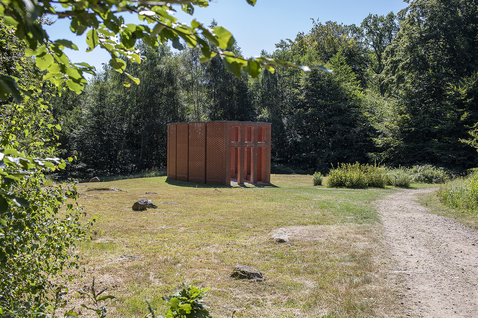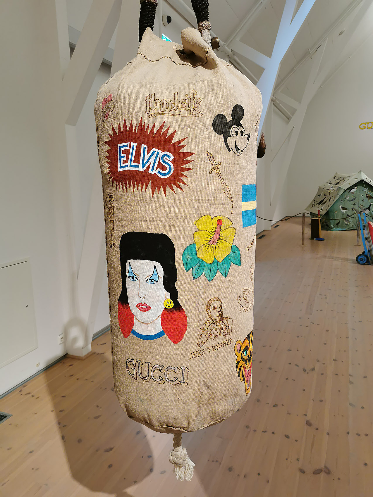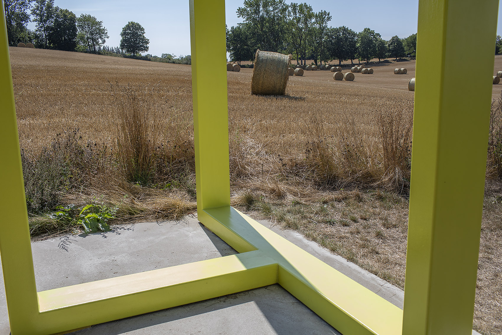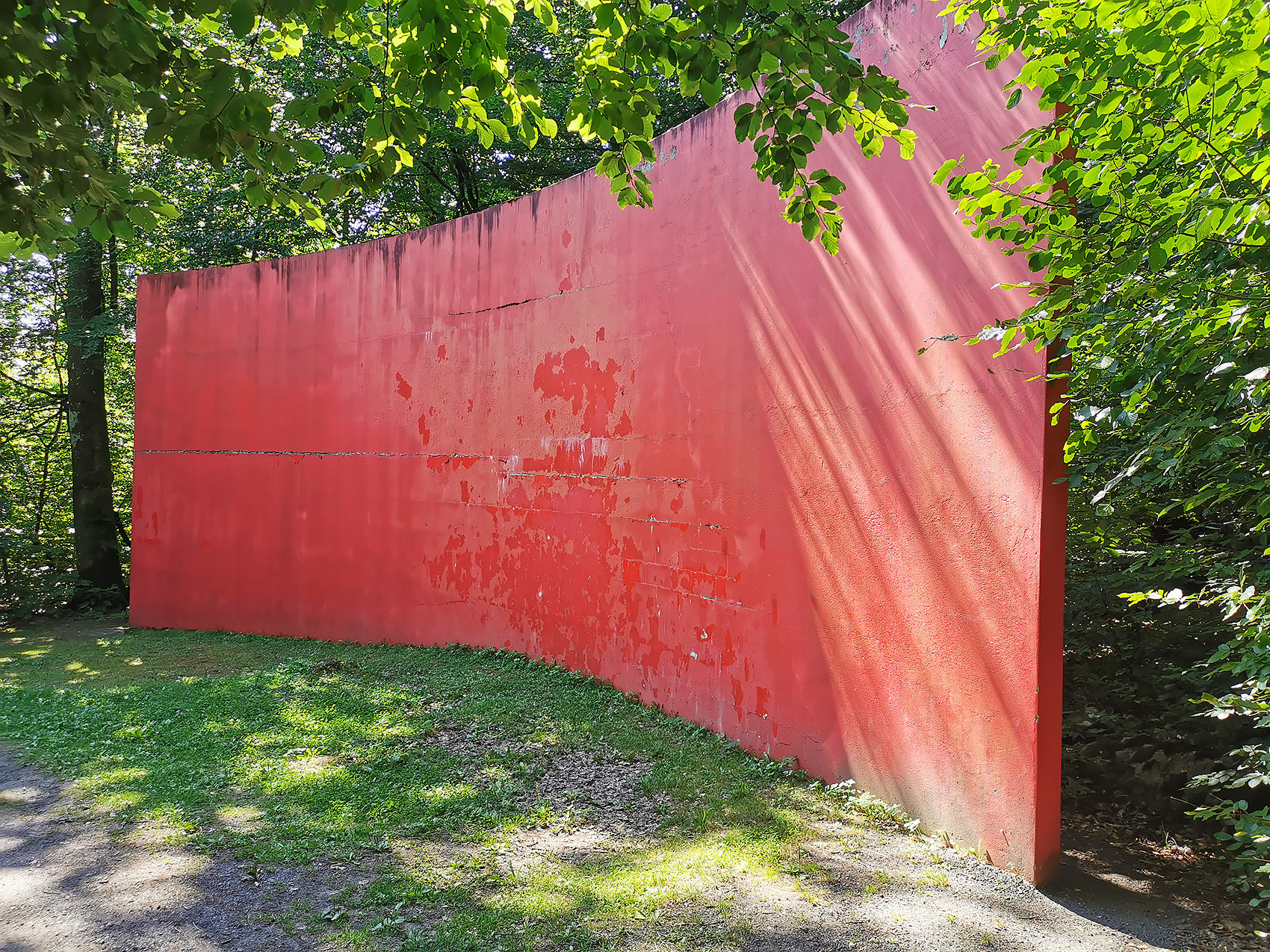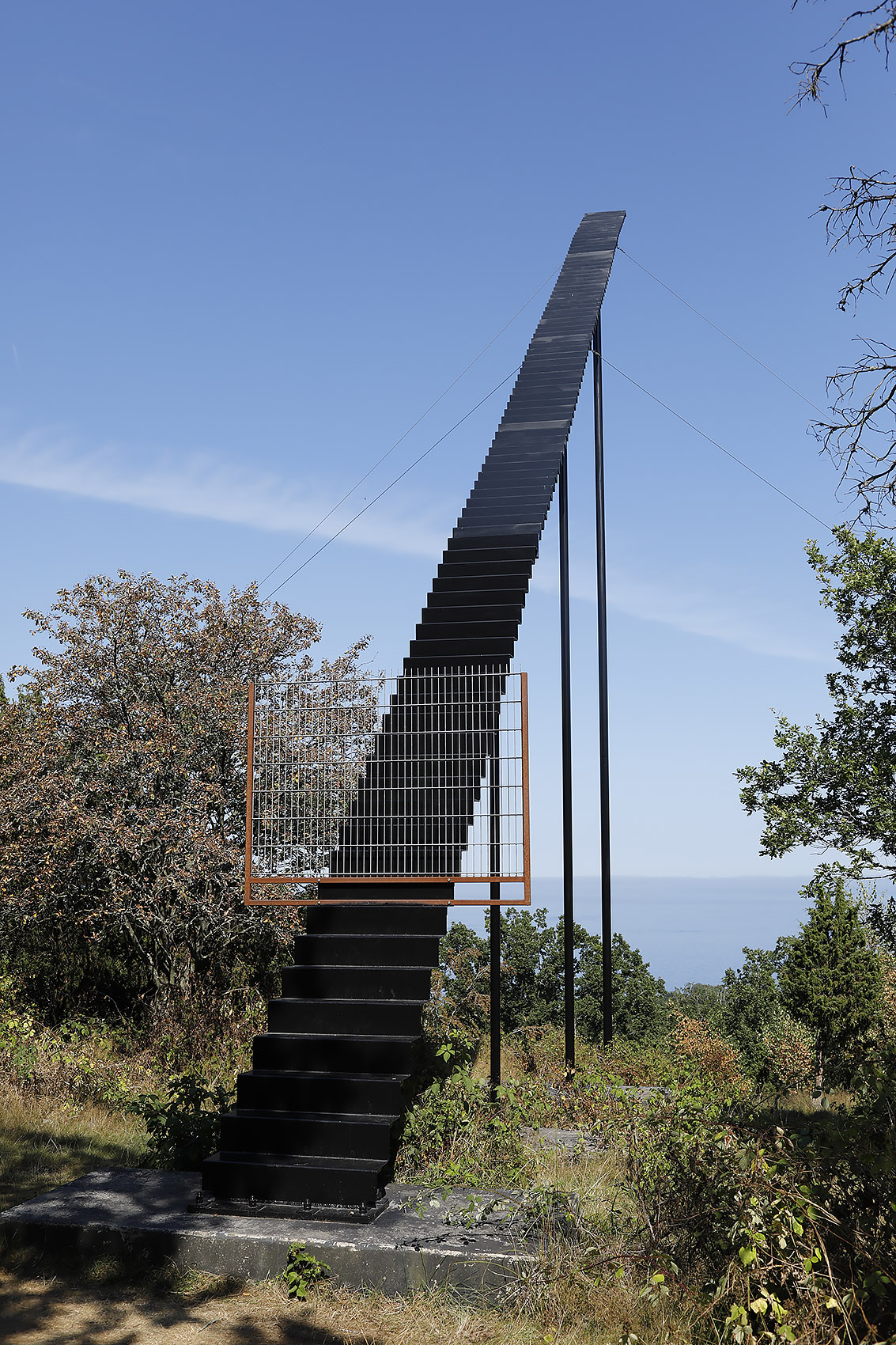 “Ni måste besöka Kivik art”, säger värdinnan där vi bor. Sagt och gjort. Kivik art består av ett antal skulpturer utplacerade runt den bergsknalle som reser sig ur odlingslandskapet en bit söder om Kiviks samhälle. Hubert Garniers skulptur “Lyckans portar” – fråga mig inte varför den heter så – gör sig bra i entrén till skulpturvandringen när man vänder sig om och genom den ser ut över de vackra nyskördade sädesfälten med sina halmrullar, konstverk i sig. Vi går vidare och där ligger årets nya verk, gruppen queercrafts verk “Rainbow”. Aluminium gör sig bra i motljus, liksom blöta vägar, eller små vattensamlingar, så jag tar en bild. Nedanför står några andra skulpturer. Bland andra Peter Johanssons “Famljelycka” där ett litet hus snurrar upp och ner. Fast nu snurrar den inte, den är för tillfället (?) out of order, liksom f.ö. en annan skulptur litet längre fram. Peter Johanssons skulpturer är tokroliga att se på och sedan får väl var och en fundera på vad den här har med familjelycka att göra. Det sista verket på vandringen är Gert Wingårdhs “Himlatrappan”, en ranglig skapelse som strävar mot skyn. Och visst vore det spännande att gå dit upp och komma litet närmare himlen, om trappan höll och det vore tillåtet, och se ut över Österlen och havet. Men då skulle väl Ulf Lundell bli ännu mer förb-nnad över att folk kunde se in på hans tomt.