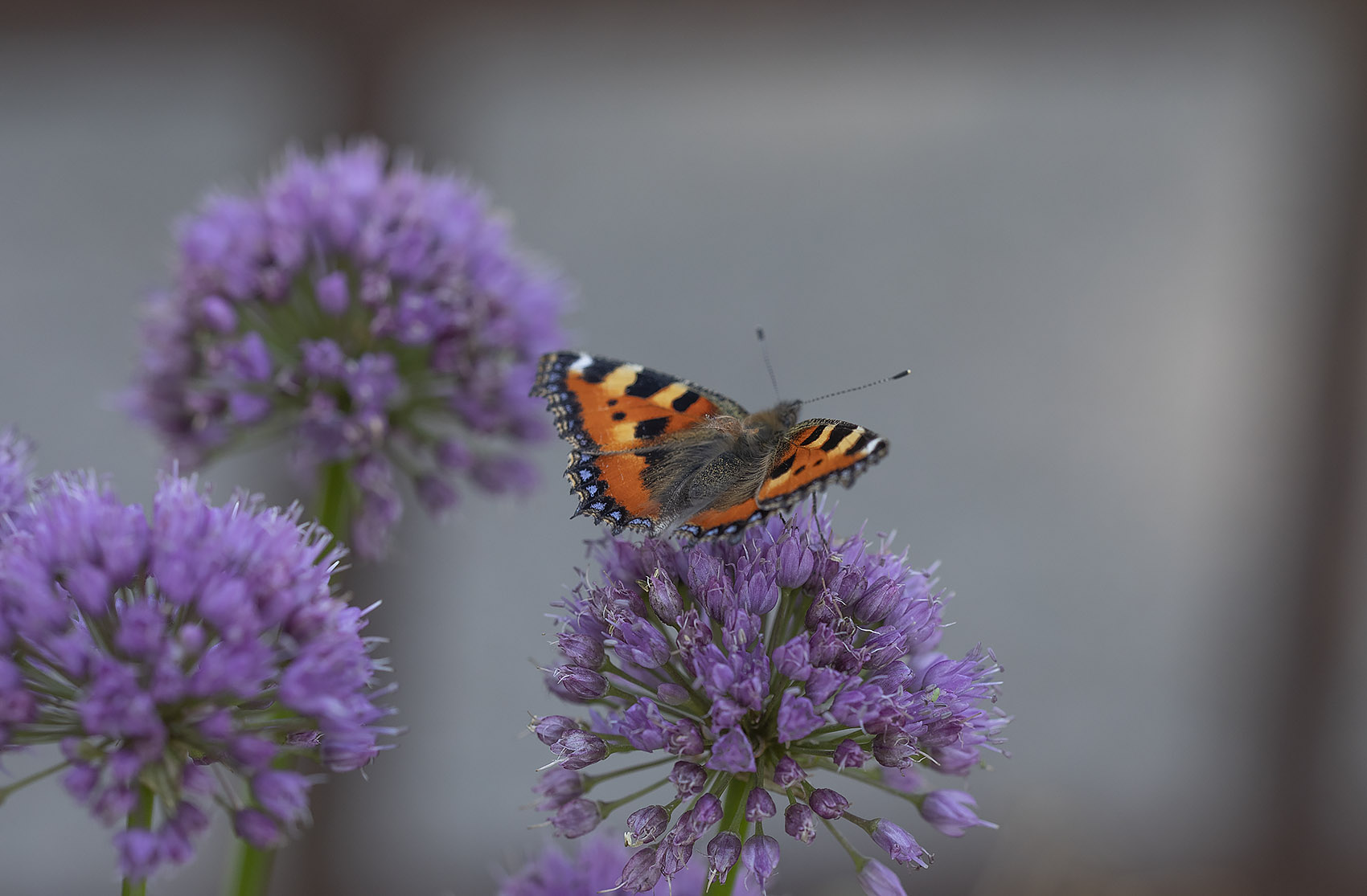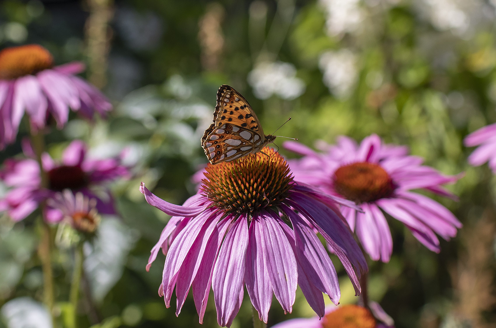 Storfläckiog pärlemorfjäril på rudbeckia, Alunbrukets café.