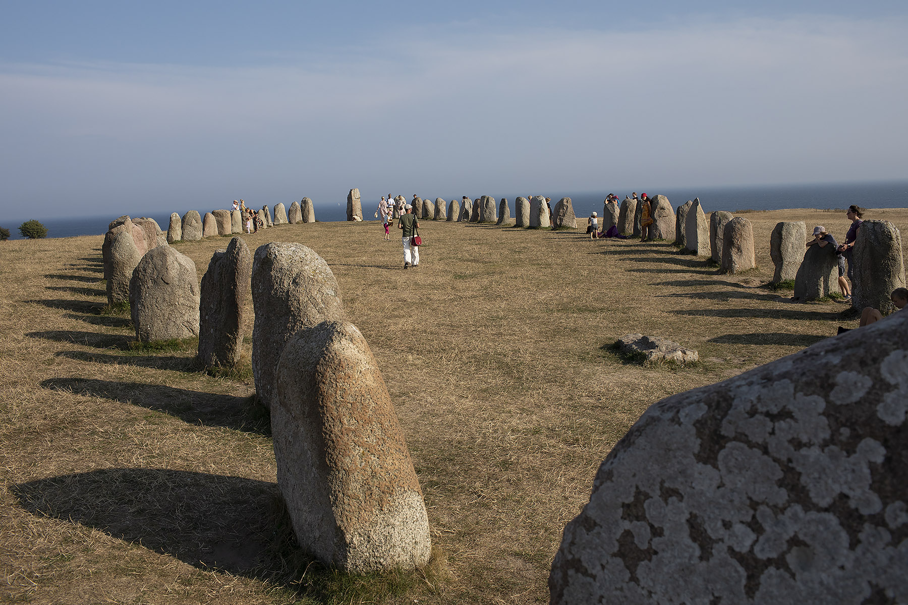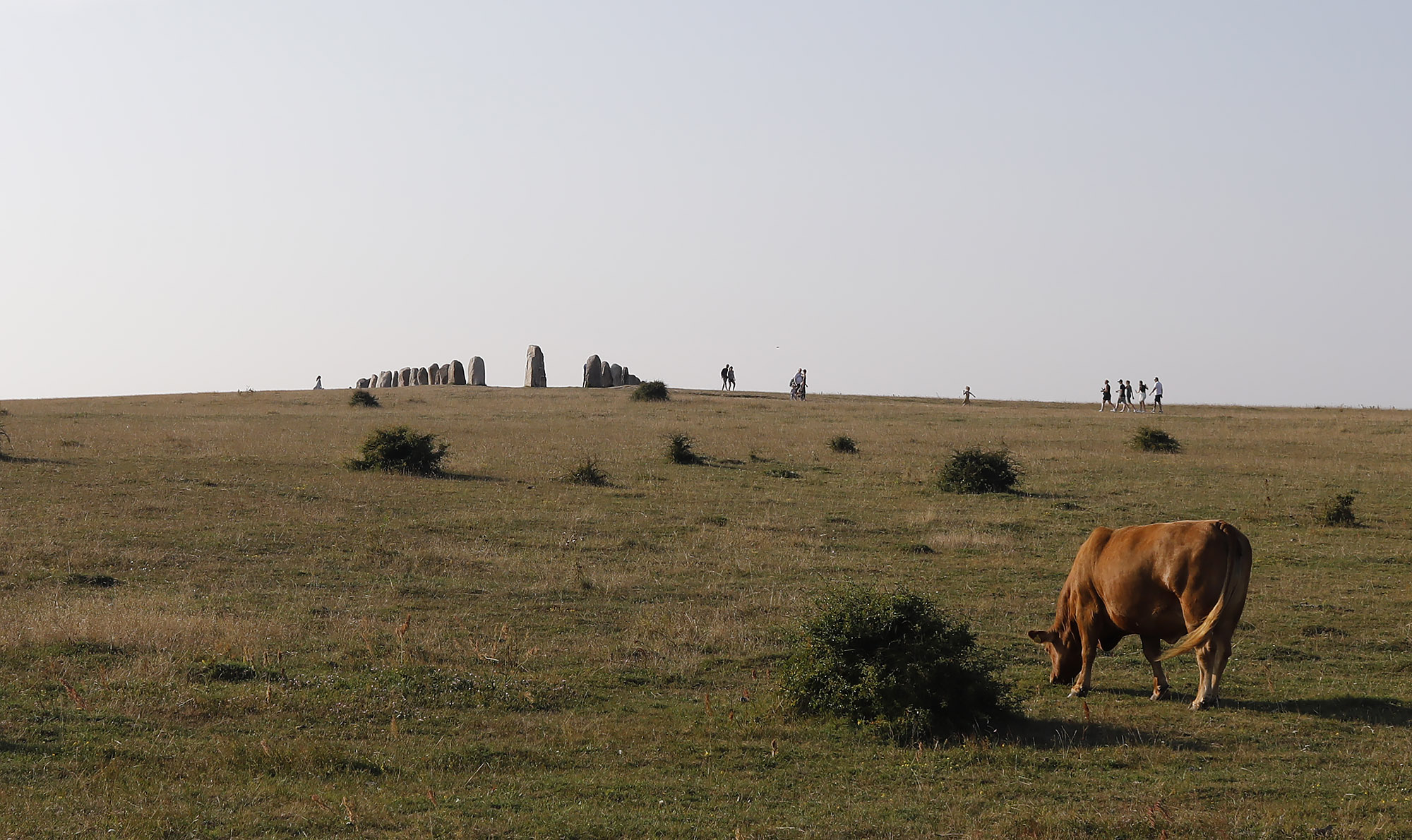 Efter Glimmingehus körde vi till Kåseberga och rättade vi in oss i ledet och följde med lämmeltåget upp till Ales stenar som är den största skeppssättningen i Norden, troligen från 600-talet e. Kr. En vacker anläggning med sina 50-talet 5-tonsstenar i båtform. Liksom vid Kiviksgraven görs här nya undersökningar som leder till mer kunskap – men också nya spekulationer. – Är inte graven i själva verket ett jättelikt solur med andliga dimensioner? De som tror på det har t.o.m. fått sätt upp en stora skylt vid entrén till ormådet där man kan läsa deras halsbrytande teorier och sedan avgöra vad man ska tro – och kanske ansluta sig till nyhäxorna när de samlas här vid vintersolståndet! Vackert är det i alla fall där skepssättningen ligger på åsen 32 meter över havet som den här dagen glimmade i solen.