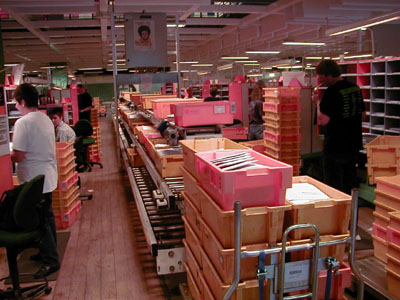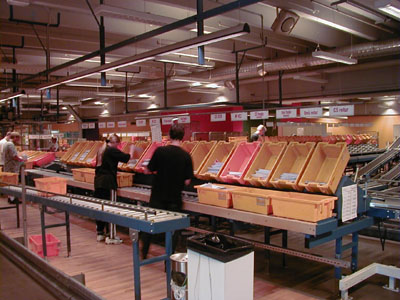 Stora brev uppsamlingssorterar 300.000 stora brev per dygn (Tomteboda ca 153.00. Samtlifa Tba-siffror år 2000, månadsvolymen delad med helgfri må-fre) plus 75.000 ekonomibrev (Tba 111.000). All storbrevssortering är manuell, man anser att det inte är någon ekonomi att köpa in SSM. I storbrevssorteringen finns ett "ackordssystem". Normen är 1.100 försändelser/timme. Då handlar det enbart om ren sortering. För det har man 100 kr/tim. Om laget (som består av högst 14 personer) sorterar mer än så utgår en bonus på 1 kr/tim per %. Sorterar man alltså 10% fler brev per timme (=1.210 försändelser) så höjs lönen till 110 kr/tim. Det är på denna nivå som de flesta lagen ligger. En snabbintervju gav vid handen att de flesta inte bryr sig så mycket om "ackordssystemet". Bonusen kan omvandlas till tid om man så vill, eller "afspadsering", som man säger på danska.