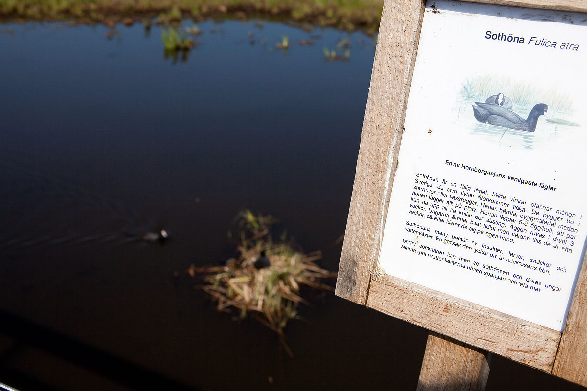 På hemvägen besökte vi som vanligt den älskade Falbygden och körde längs Billingen ovanför Hornborgasjön, en av de stora svenska utsikterna. Vi stannade till vid Naturumet och alldeles under spången ut till det stora fågeltornet låg sothönan och ruvade! 2011-05-10.