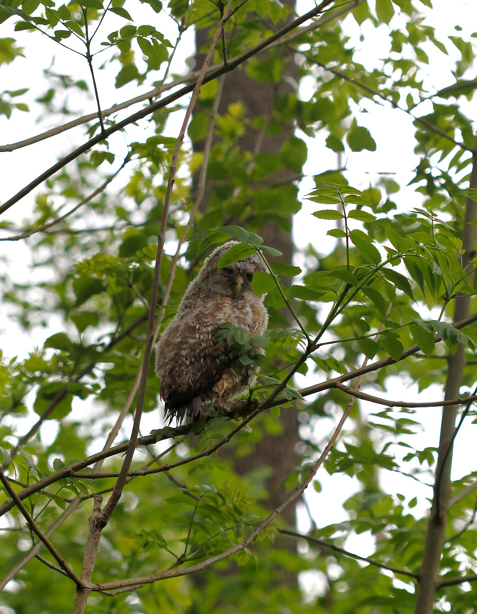 ... och i en liten ask sitter årets kattuggleunge och trycker, nyligen utflugen ur holken, en riktig rugguggla denna råa och fuktiga morgon!