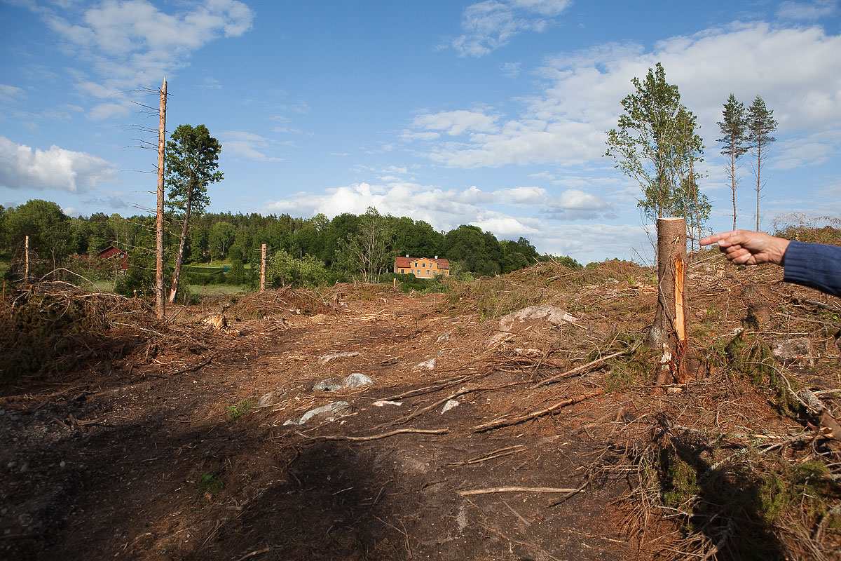 På semester i Sörmland på stället med utsikten som man aldrig kan se sig mätt på. Jag vet att mina vänner på facebook och läsare på hemsidan helst vill se vackra bilder från utsikten man aldrig kan se sig mätt på, men idag vänder vi blicken åt andra hållet där det bakom potemkinridån av sparade aspar öppnar sig ett alldeles nyupptaget kalhygge. Det är en förfärlig upplevelse för den som nyligen gick där i svalkan under granarna och letade efter svamp. Och har gjort det så länge man kan minnas. Men även kalhyggena har sin skönhet och i sommarkvällen går jag högst uppe på bergsryggen -- hur f-n kan maskinerna ta sig upp och ner för sådana branter, och utan att brytas sönder?! -- med utsikt över fälten. På ena sidan går en dovhjort och betar i veteåkern, jag ser bara den mörka ryggen på den. Åt andra hållet utspelar sig ett minidrama. En älgko står ensam i kanten på en nyslagen åker. En räv kommer gående alldels intill älgen och fortsätter in i slyet vid sidan av åkern. Kon vänder sig om och följer efter. Mycket riktigt: hon har en kalv därinne. En älgko låter knappast en liten räv röra sin kalv. Jag sitter länge och tittar på dem där de står inne i slyet; kon betar med kalven tätt intill sig och räven försvinner någonstans i buskaget. Jag har skrivit om kalhyggena tidigare, bland annat här!