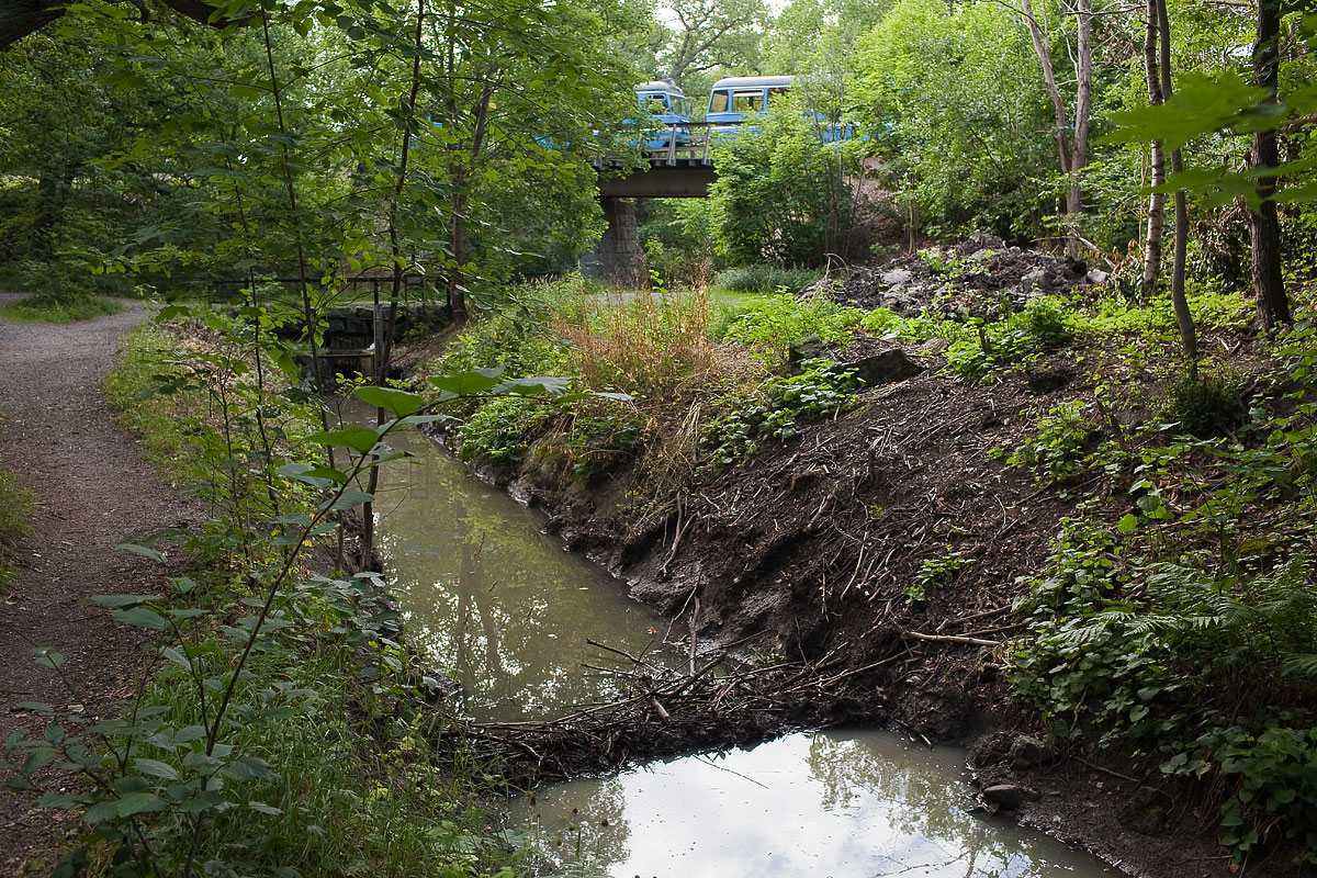 Människan spår, men bävern rår... Villaägarna längs Kottlasjön (en handfull) är förtvivlade över bäverns framfart och därför har kommunen tagit till det tunga artilleriet och grävt ur ån med grävskopa ... men bävern är snabbt där och reparerar sin damm! 2011-07-26