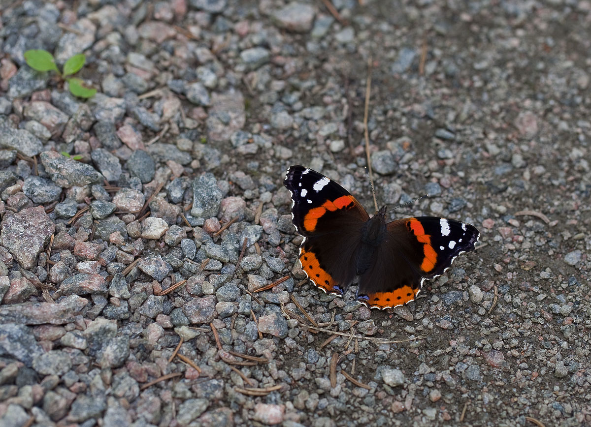 En av sensommarens första amiraler kom och landade i min skugga på grusvägen! Össebygarns s:n, 2011-08-01.