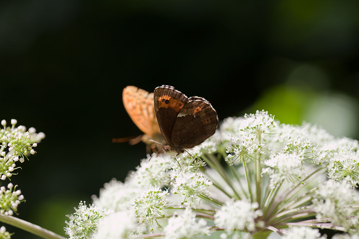 Skogsgräsfjärilarnas tid är snart ute, här ett slitet exemplar. En ännu mera åtgången silverstreckad pärlemorfjäril i bakgrunden. Össebygarns s:n, 2011-08-01.