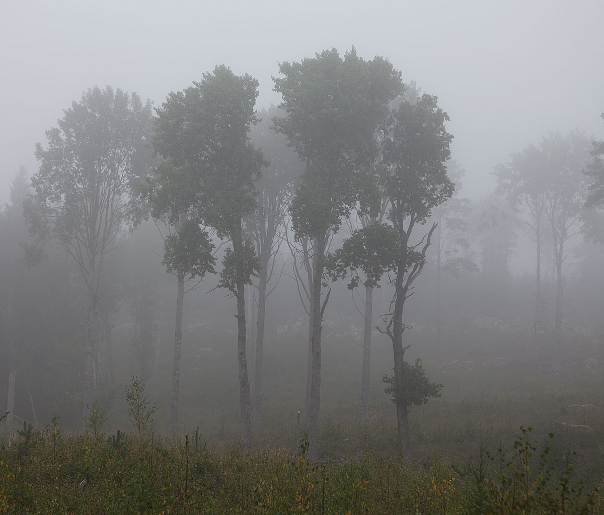 En tidig morgonpromenad i dimman. Slog ihjäl några myggor, skrämde upp en tjädertupp vid Fyra ekar, gärdsmygen sjöng en kort strof på hygget. Annars tyst, tyst. Sopparna på stark frammarsch, men inga kantareller än. 2011-08-28