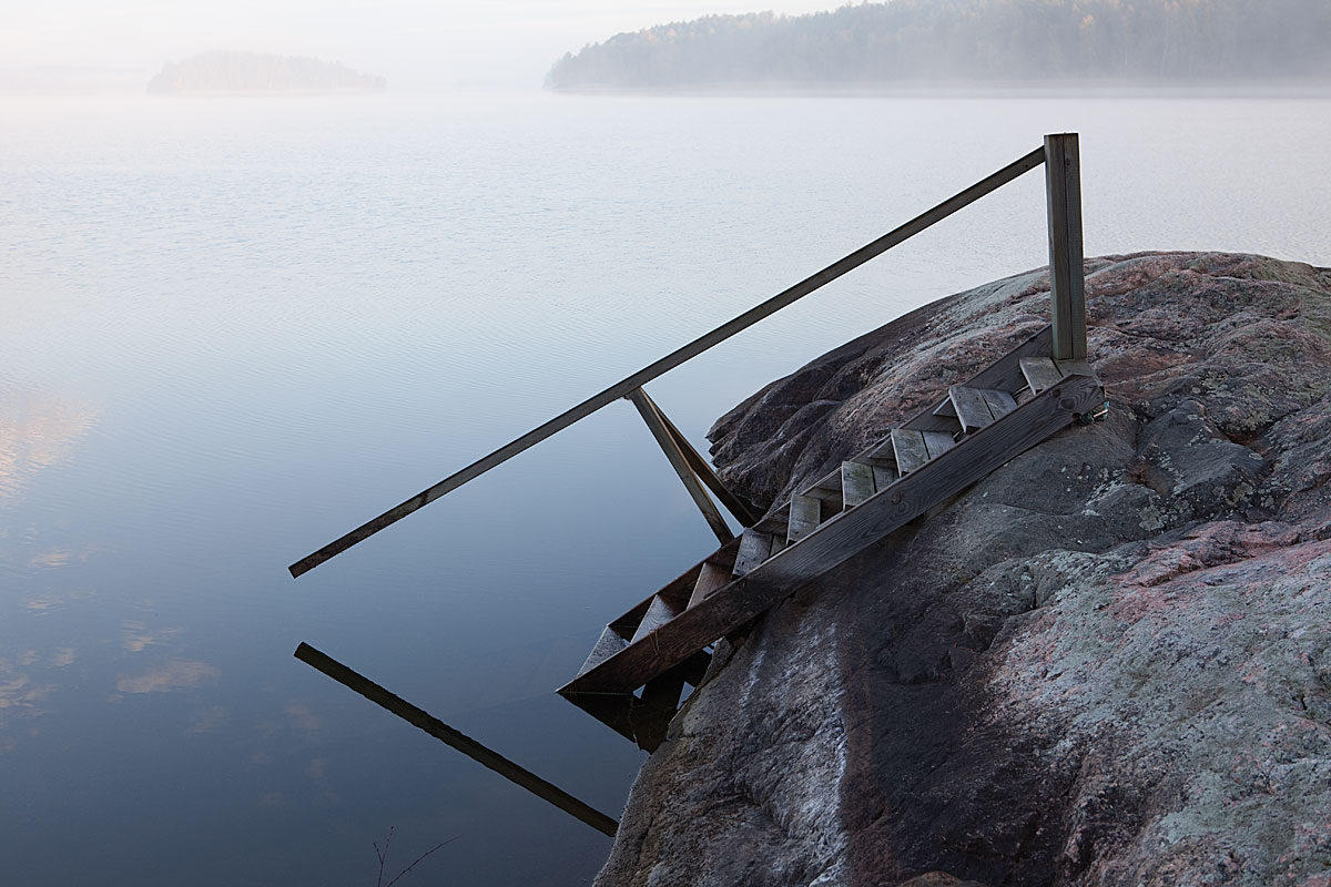 Disigt och varmt för årstiden. Tyst. Går en tur till andra sidan sjön och röjer litet längs stigarna. Avslutar dagen med en bastu. 2011-11-07.
