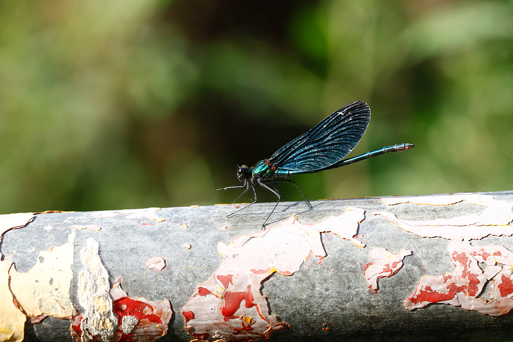Gärna en VM-final, men först en rejäl svettdag vid torpet! Åter från exilen i Sörmland, firade det med vattning & gräsklippning, massor av fjärilar och ännu sjungande svarthätta, järnsparv och ärtsångare. Den här skönheten satt på vägbommen när jag åkte hem, blå flickslända, tror jag.
