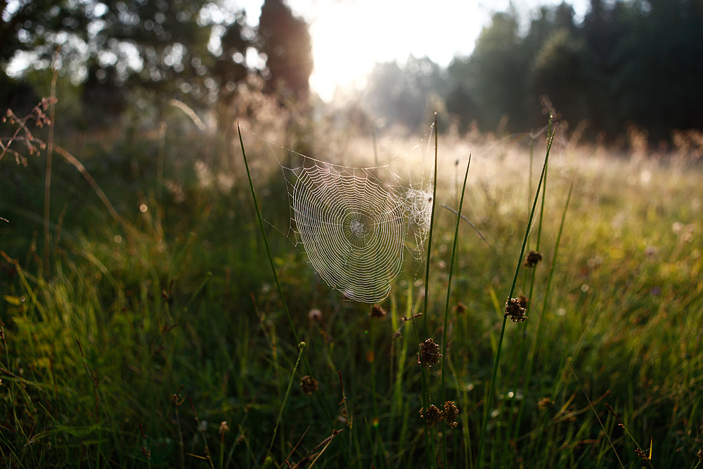 Uppe tidigt, tidigt i morse och gick en tur i varglandet. Såg inga vargar, inga lodjur heller, men ett rådjur skällde på mig, två tranor flög över och spindelnäten blev synliga i morgondimman.