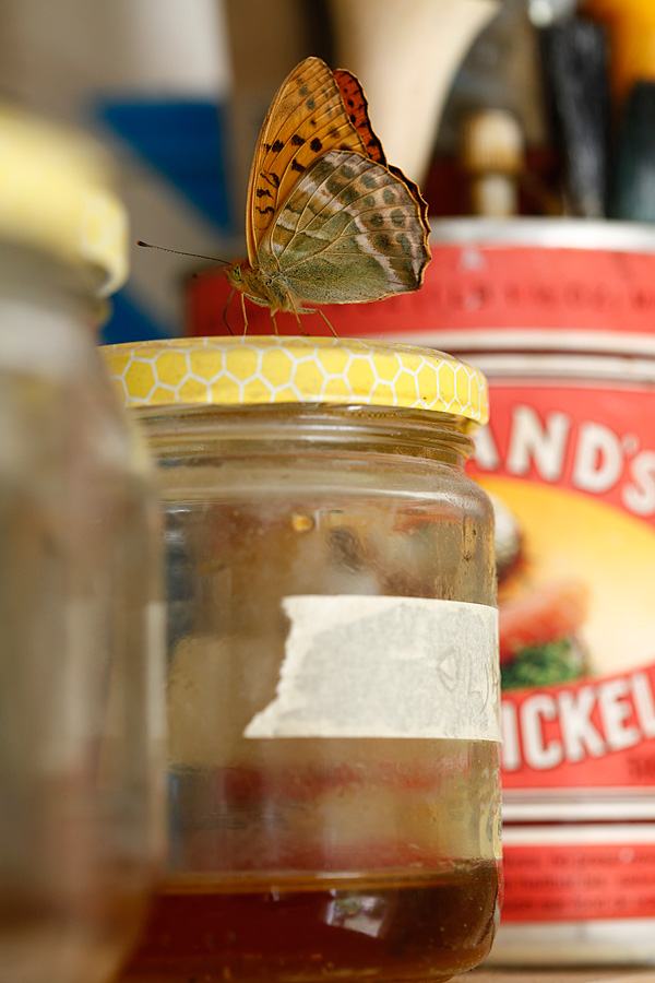 Fjärilsskolan: Den silverstreckade pärlemorfjärilen har flugit in i farstun och slickar av locket på linoljeburken!