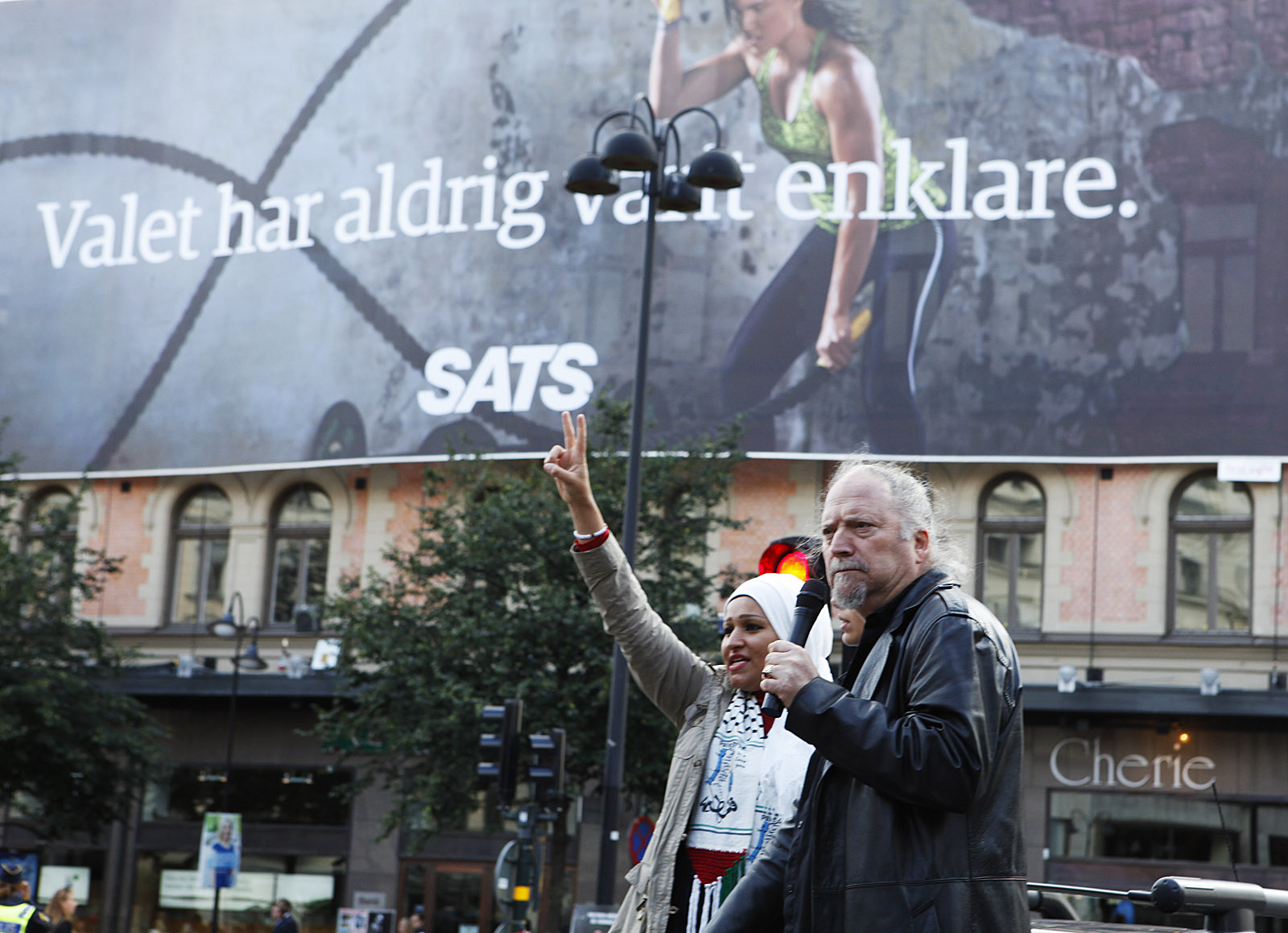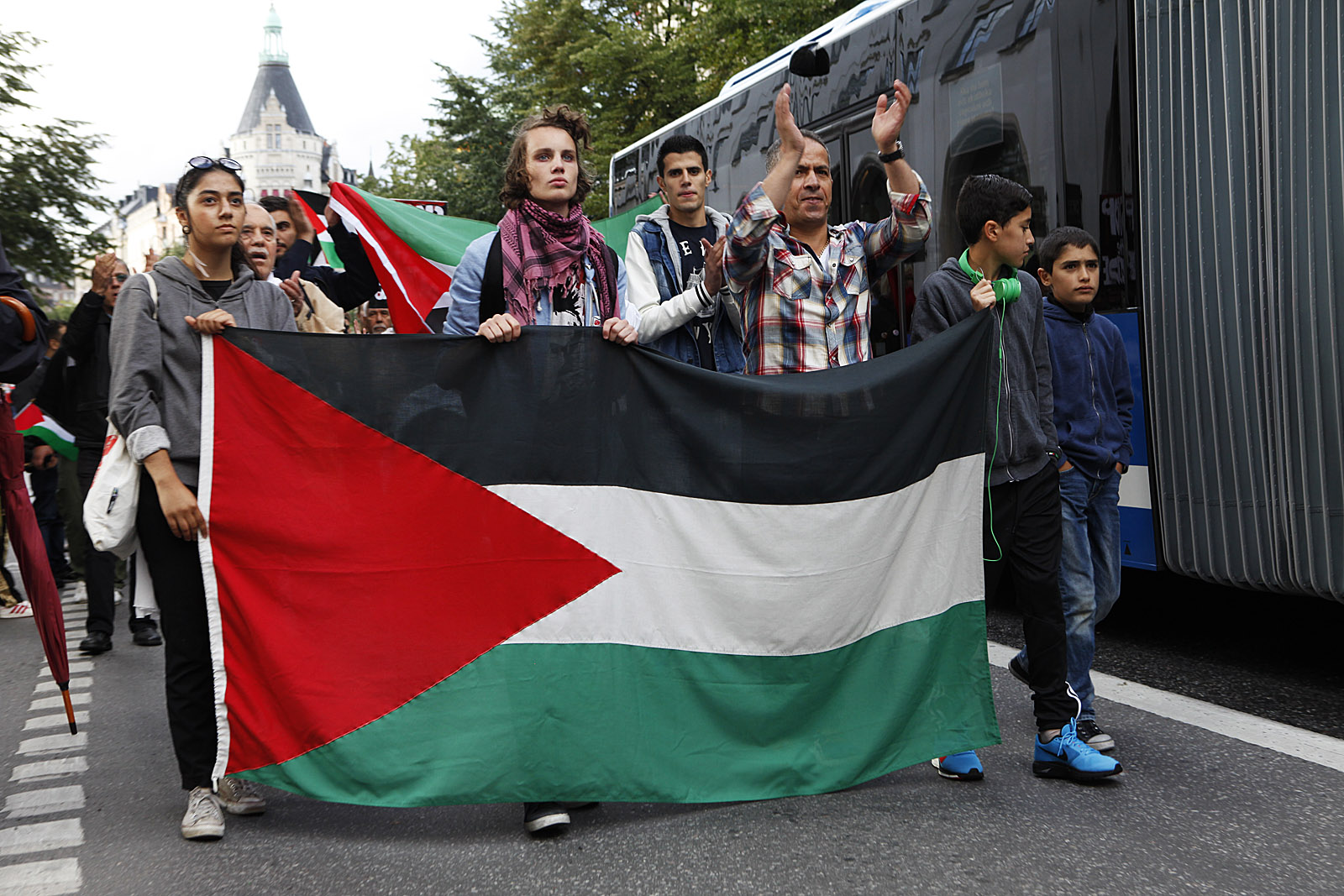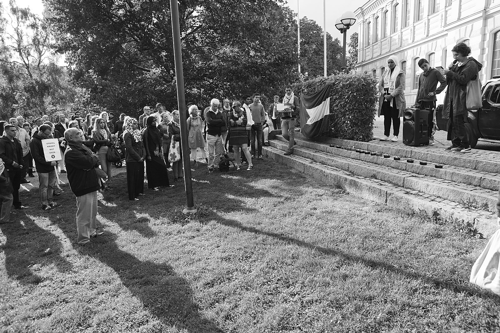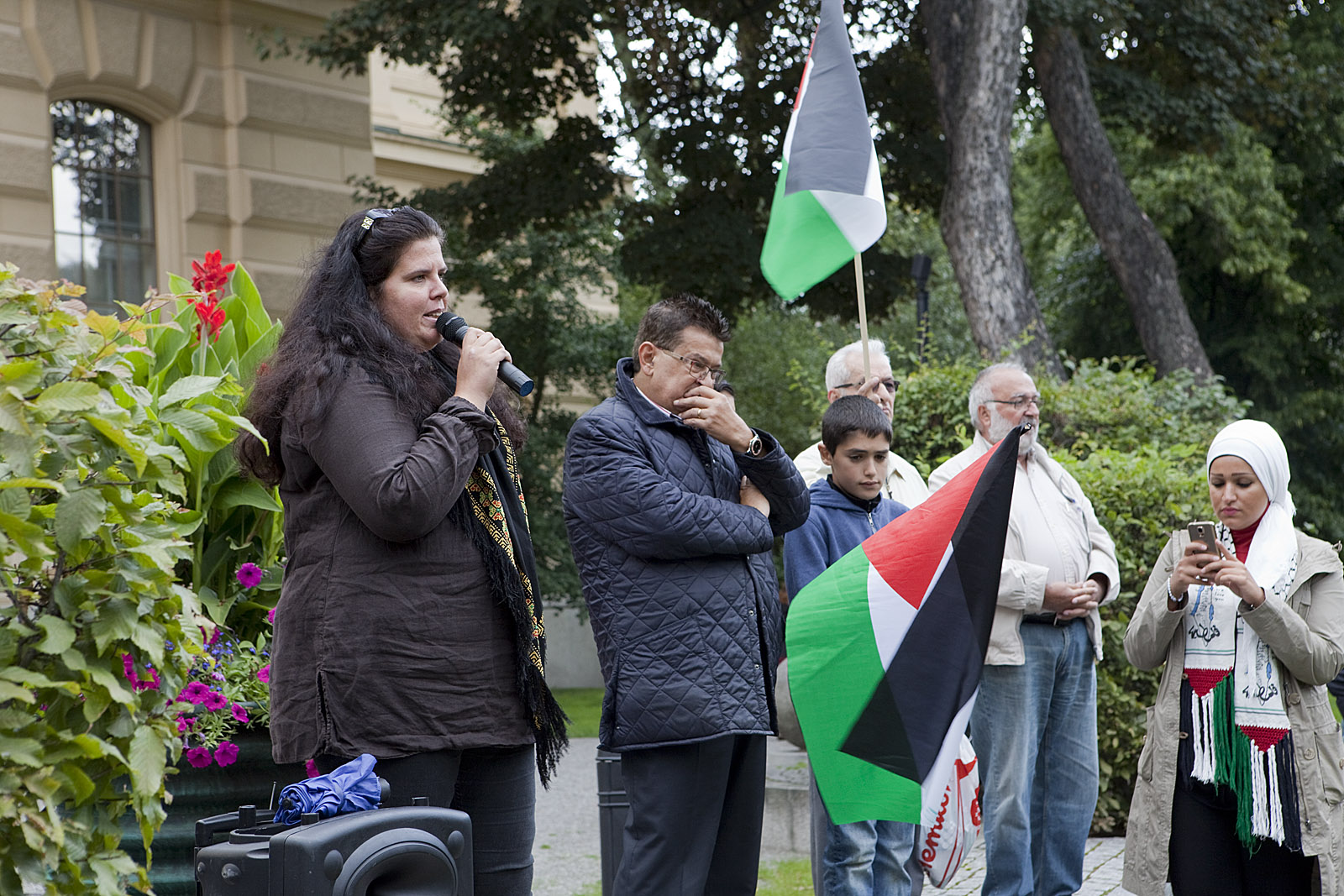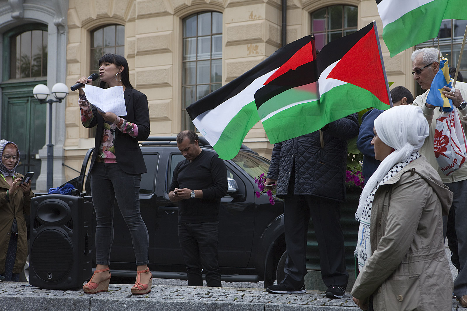 Dror Feiler leder talkören vid Palestinademonstrationen i Stockholm den 23 augusti. Inte så många deltagare den här gången, men en naggande god manifestation till stöd för palestinierna mot Israels ockupation och ständiga mördande. Fina tal av bla (v):s Selnah Alsaati och Yvonne Ruwaida, "miljöpartist men inte representerande partiet". -- Men ännu ingen partiledare eller regeringsledamot i talarstolen! De dyker väl upp nästa söndag (31 augusti) när Sionistiska federation i Sverige anordnar en manifestation i Stockholm till stöd för Israel och dess bombningar!