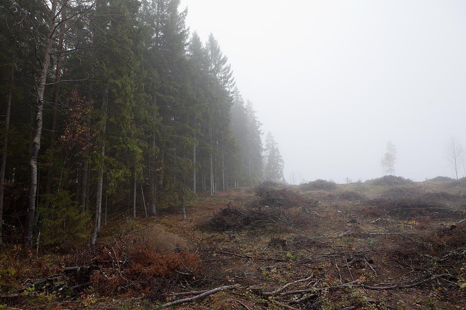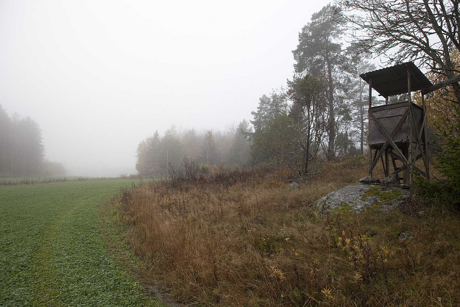 I 47 år har jag gått ut i skogen den första älgjaktsmorgonen. Ifjol blev det en kort första dag: vi sköt fullt redan kl 7 på morgonen. I år blev det nästan ännu värre, eller mera lyckat, hur man nu vill se det: 06.40 sköt en morgonpigg medlem i jaktlaget vårt enda tilldelade vuxna djur. Det blev en 4-taggare fick vi andra veta när vi just hade stigit ur våra bilar för att gå ut till passen. Så kan det gå! Sen blev det en kalv också på eftermiddagen. Dagen blev litet sönderhackad och annorlunda mot alla de gånger som man har suttit hela dagarna i skogen från morgon till kväll: hört sparvugglan med sina konstiga höstläten i mörkret på väg ut till passet, flyttfåglarna som kommer in från Ålands hav när det ljusnat, målflygplanen från LvSS i sina evighetsåttor, och sedan de trötta stegen tillbaka i skymningen. För så är det: det är naturupplevelserna som har varit den största behållningen för min del, det blir inte av att sitta en hel dag i skogen annars. Spänningen ska inte underskattas, och den sociala samvaron. Och det fina älgköttet förstås, mera ekologiskt än så kan det inte bli! Men de starka naturupplevelserna kommer först. Kanske ska jag lägga till, så här efteråt när jag börjar summera mina år i skogen: hembygdskänslan. Vid den och den åkern, under de och de granarna satt morfar, Sture, Kilpojkarna, Jimme, Smen ... Och så vi, som fortfarande lever och ännu en tid jagar i samma lag, och de som har flyttat härifrån eller de som har gått över till andra jaktlag – det är inte bara vänster- och högerpolitiska grupper som förökar sig genom delning, det kan även gälla jaktlag. Jag har en del bilder från åren som gått, bilder som bär upp minnet av jakterna, människorna, passen; byn. Nu går jag runt och fotar samma ställen i den mån jag återfinner dem i det hårdhänt – eller helt enkelt bara övergivna – starkt förändrade landskapet. Annars är det svårt med jaktbilder. Jag läser nästan aldrig några jakttidningar, det blir bara för mycket. Det räcker med att följa Svensk Jakt på webben, då får jag veta om det är någon nyhet i lagstiftningen som jag bör känna till och framför allt kan jag hålla litet koll på hur denna jägarnas officiella röst låter. Även det kan bli litet för mycket! Det är ett ständigt kampanjande mot de andra rovdjuren – men ingenting mot dem som planterat ut vildsvinen och de som skeppade över rådjur till Gotland.