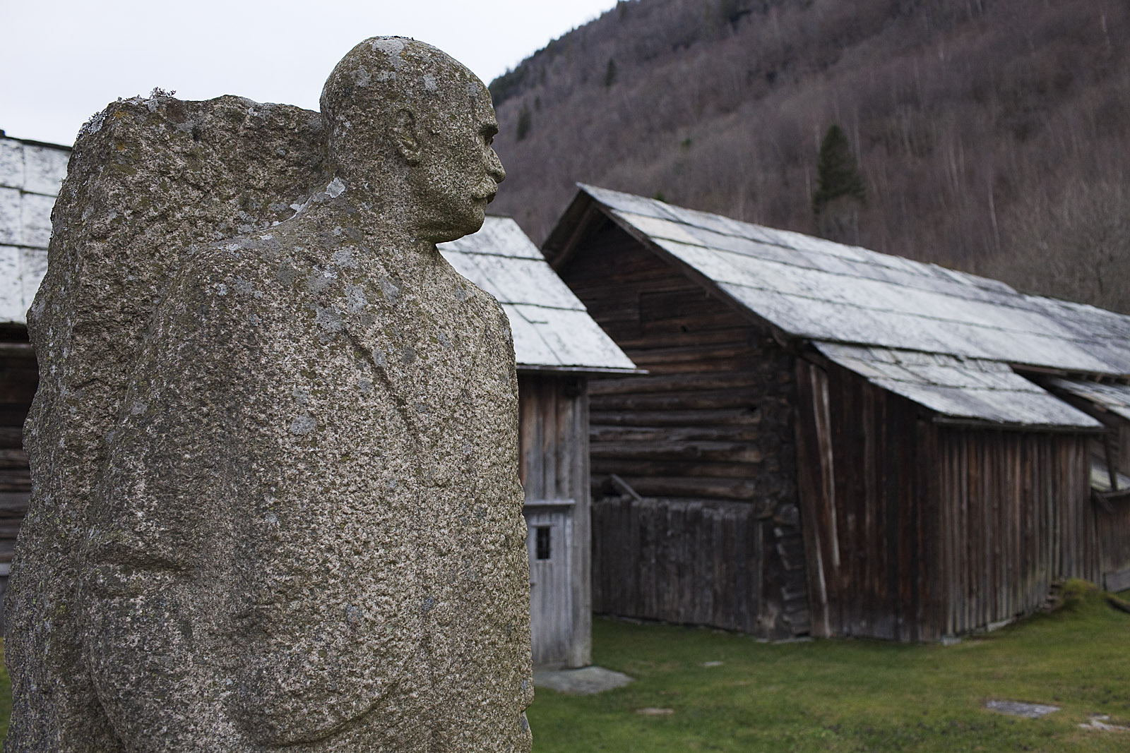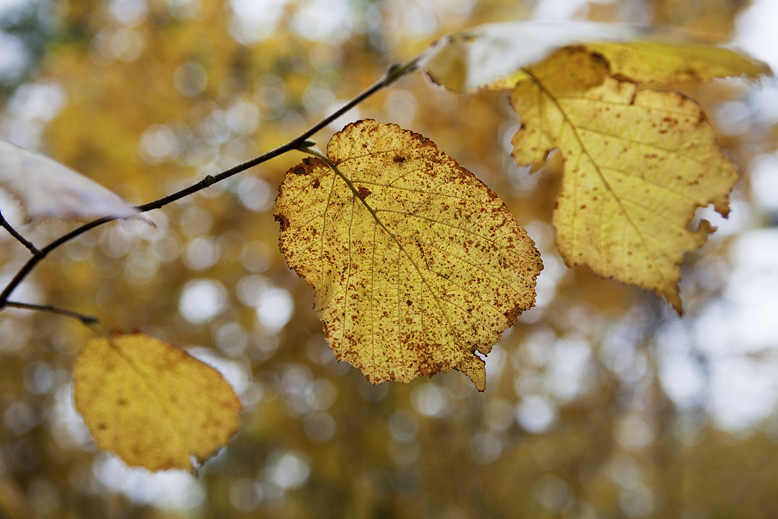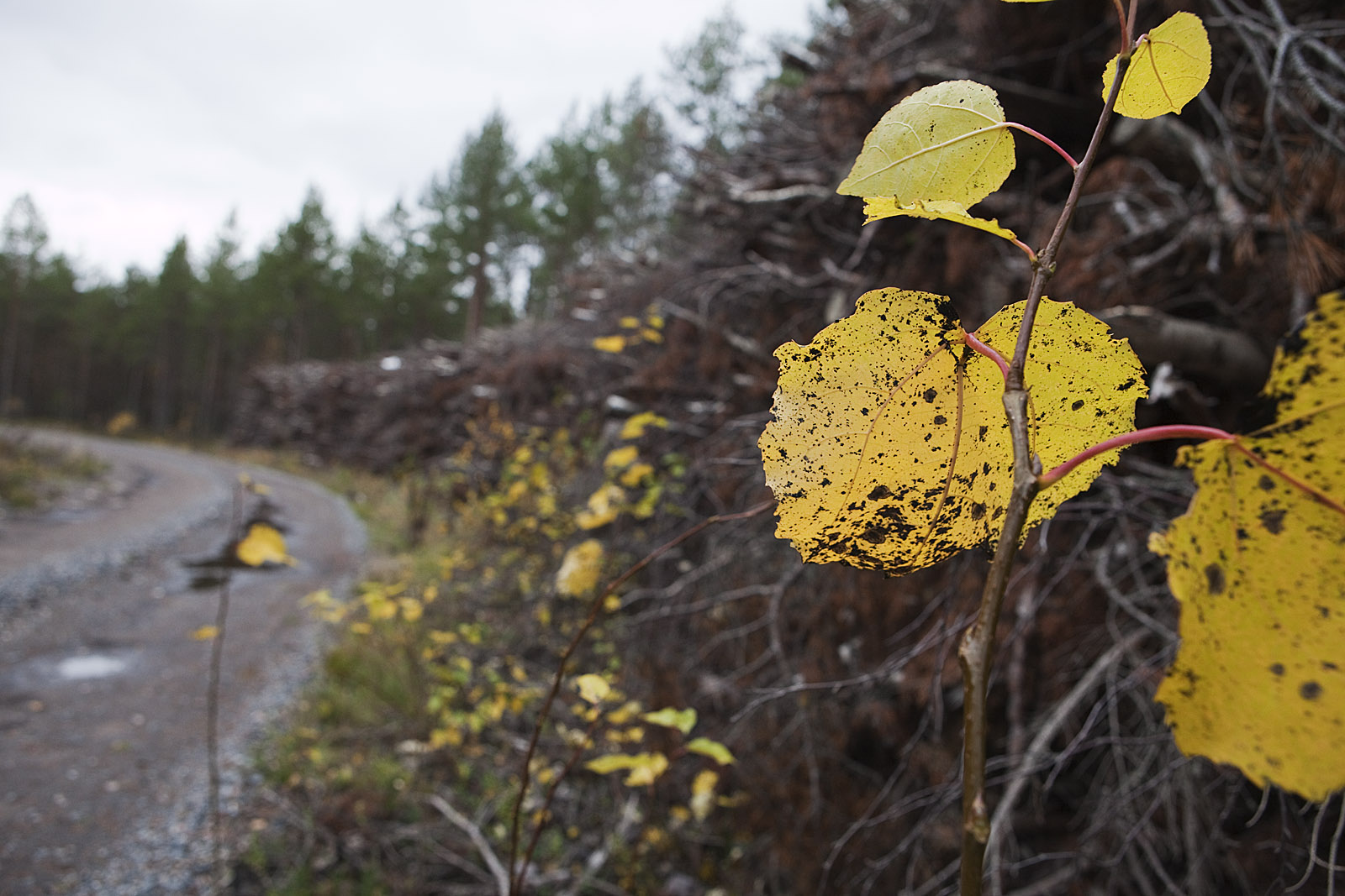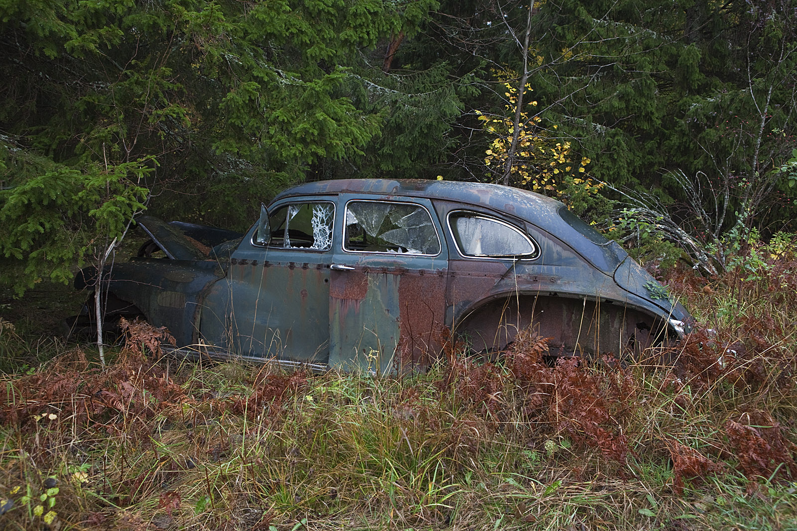 Jag går ännu en lång vandring på hembyns marker. Det är en stilla morgon med dimma och ett vackert, mjukt ljus, så bra att fota i. Det är med en stor glädje men också med ett visst vemod när alla minnena väcks till liv och ramlar över en. Jag tar bilder på ställen där jag plåtade för över fyrtio år sedan, och jämför. Ofta en trist historia eftersom så mycket har vuxit igen, övergivits eller älskats alltför hårdhänt med tunga maskiner som har kört sönder och huggit bort. Men i backarna vid Windholmen växer ännu hasseln och nu står löven, ja hela slänten, i gult. Vi är inne i de gula veckorna nu. Det är vackert och ännu vackrare blir det när jag litet senare hör nötkråkan, denna stiliga fågel, jag kommer att tänka på Sven Bertil Taube!, som alltid hördes under älgjaktsdagarna när de flög från hässlena upp mot den gamla skogen för att gömma sina nötter inför vintern. Nu är det mesta av gammelskogen borta, här som på de flesta andra ställen, och därför även nötkråkan. Men några finns alltså kvar! I skogskanten står en gammal bil inkörd, ett minne från kräftfiskets storhetstid, en av storbondmorans utrangerade fläskdroskor. Det stod en till uppe på berget, men den åkte i sjön en natt för många år sedan. Nu är den sådär patinerat vacker som bilvraken blir när de får stå övergivna i skogen i många år; att fota skrotbilar har blivit en egen riktning inom samtidsfotografin och någon av bilkyrkogårdarna har tom blivit k-märkt! Den här bilen står ensam och påminner mest om hur stort kräftfisket en gång var, liksom byträtorna kring det och skvallret som påstod att bondmoran gick ner till sjön med filten under armen tillsammans med A., ungkarlen från granngården. Detta byskvaller som nu sätts på pränt, med en viss skadeglädje måste jag erkänna eftersom de utpekade tillhörde fiendesidan i byn.
