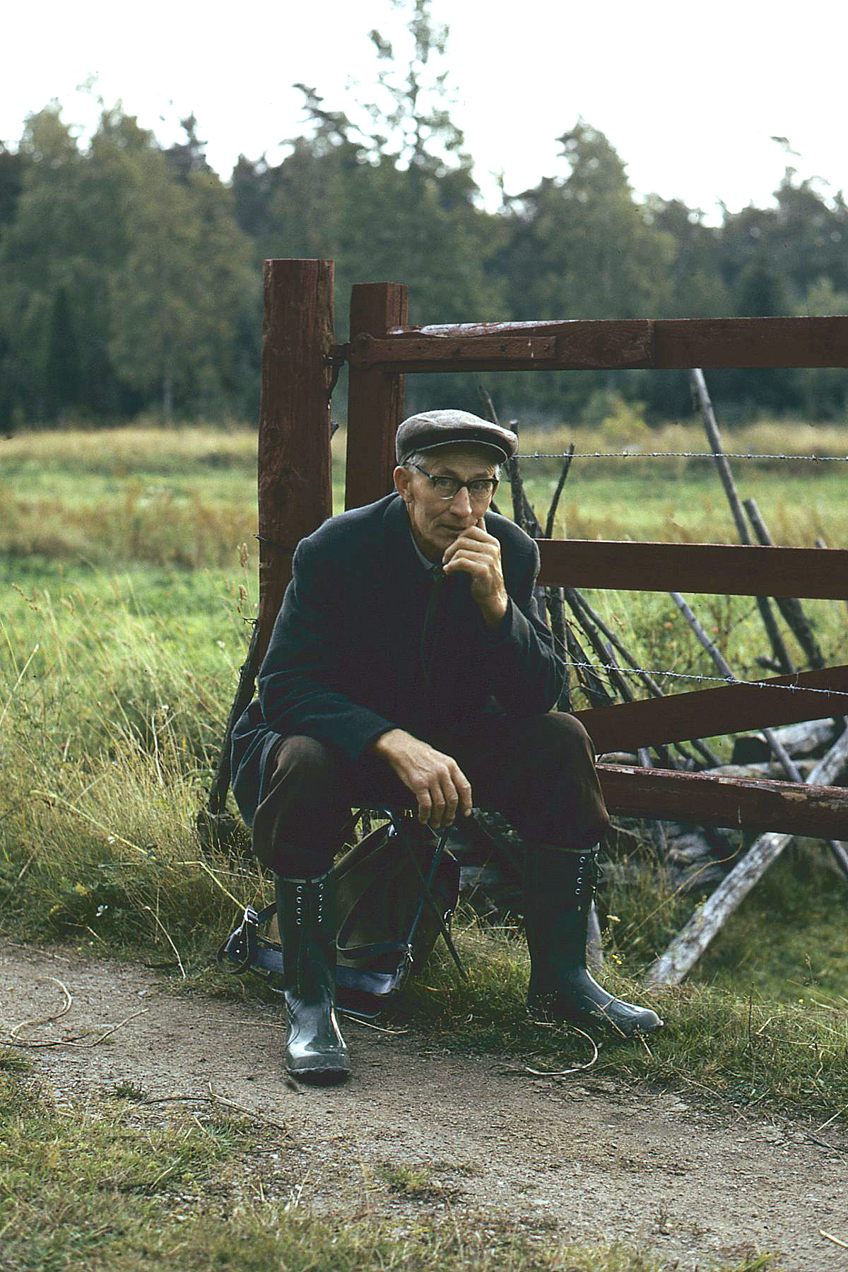 Morfar tittar in i kameran, på månaden när för fyrtio år sedan. Vi är på harjakt en septembermorgon 1974 och har tagit fikapaus vid en grind på gamla Sjöströms, som vi sade på den tiden. Idag står bara en av stolparna kvar, tom och ensam, den andra är borta, liksom grinden och stängslet. Och morfar är död sedan 37 år. Jag möter en äldre kvinna vid grinden, hon är ute och går tillsammans med dottern och en väninna. Hon är ingift i byn, men har bott här länge och är intresserad av vår historia. "Jag tyckte jag såg en grön gubbe där borta vid landsvägen och jag undrade var han tog vägen, men här är du!", säger hon. "Direkt från Mars, jag landade i morse", skämtar jag tillbaka, och vi skrattar. Efteråt slår det mig att hon kanske tänkte på de "gröna gubbar" som ryssarna skickade till Krim innan de tog över halvön? Då fastnar skämtet i halsen, men nu ska jag inte skriva mer om det i det här sammanhanget. Vi pratar om gamla minnen från byn, om hur det såg ut då, och nu, och enas om att det är synd att så mycket av de gamla körvägarna och stigarna och åkerlapparna har försvunnit – men vem ska ta hand om dem?! Jag är på väg mot den lilla sjön längst upp i byns skog och de berättar att de inte hittade dit när de gick här för något år sedan. Jag säger samma sak, att jag också hade svårt att hitta till sjön förra gången jag gick här. Efteråt, när jag har kollat i mina anteckningar, ser jag att det var för 21 år sedan. Så fort tiden går! De önskar mig lycka till och vi slutar detta glada samtal med att de i alla fall vet vart jag var på väg ifall jag skulle gå bort mig och man måste leta efter mig!