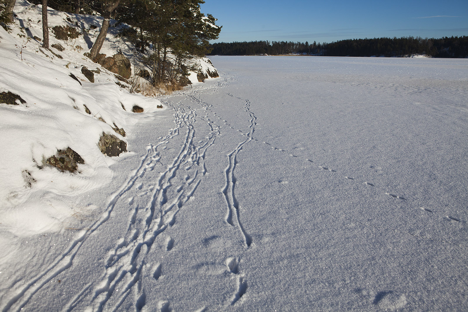 Den 22 februari 1962 noterar jag i min Naturdagbok att jag har följt en utter i spåren. Den hade gått upp ur ån i hembyn, vandrat flera kilometer genom skogen till nästa by och därefter fortsatt ner till Vätösund. Samma sak upprepades ett år senare. Då hade den valt en mera östlig rutt men det blev en lika lång skogsvandring och målet var även denna gång Sundet. På den tiden såg jag som regel spår efter utter varje vinter. Sedan minskade den kraftigt till följd av gifterna (pcb) i Östersjöns vatten. Nu har gifthalterna gått ner och därför är den, liksom sälarna, på väg att återhämta sig. Återigen kan man se spåren efter den på sjöisarna i Roslagen, och har man riktig tur även se den live. På vintrarna, när isarna har lagt sig, springer den från det ena öppna vattnet till nästa och ibland kan jag tycka att det är en farlig vandring, även om det numera inte finns några vargar i området. Kanske vågar sig inte räven på den? Vi såg ett program på TV om den utter som lever i Amazonas floder. Det är en riktig tuffing och visserligen större än vår art men när de gav sig på en kajman, brottade ner och tog död på den börjar man undra. Kanske är det bäst att våra rävar passar sig! Men lon? Hursomhelst är det alltid lika roligt att se de lekfulla spåren. När vi gjorde vinterns första isvandring vid Eremitkojan för en vecka sedan hade två uttrar spungit tillsammans längs sjön vid niotiden samma morgon. Den hade kommit från utfallsdiket och kanske var målet nästa sjö, men så långt hann vi inte följa dem. (2016-01-06)